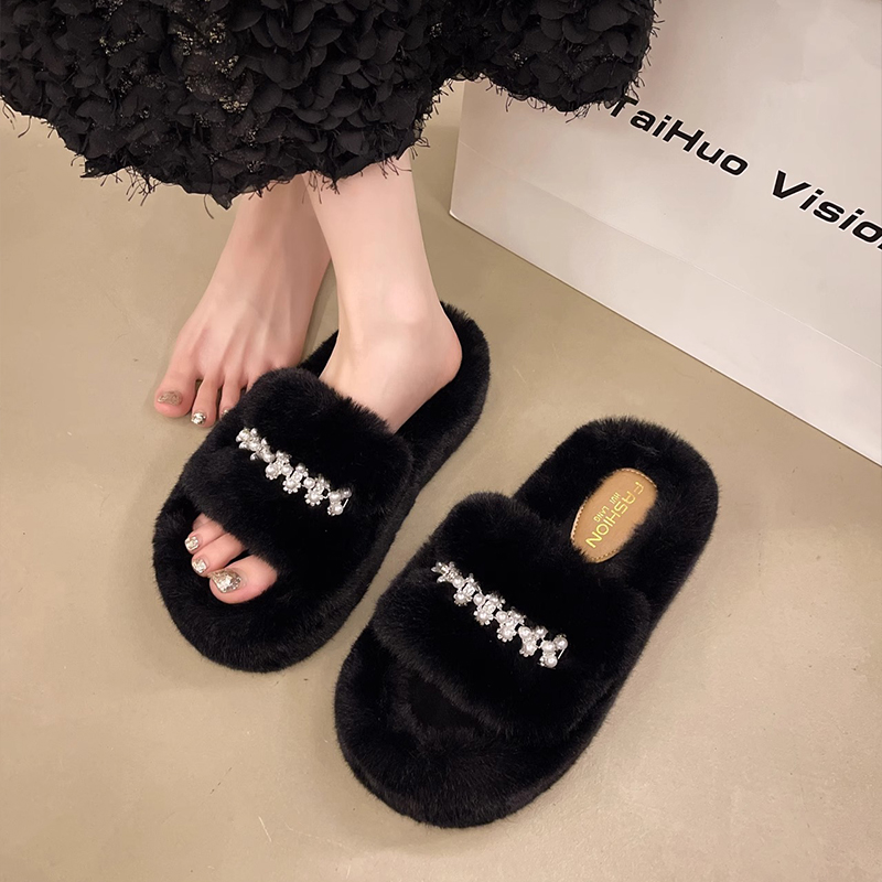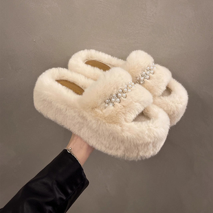 子 毛毛外穿水钻一字带增高居家棉拖鞋 厚底秋冬拖鞋 女网红2025新款