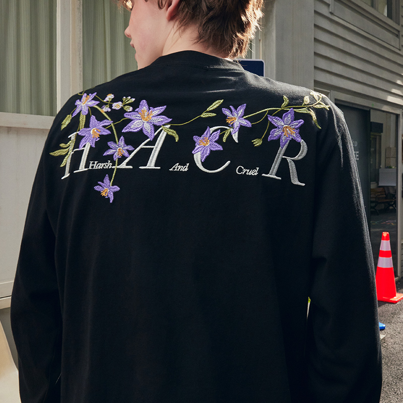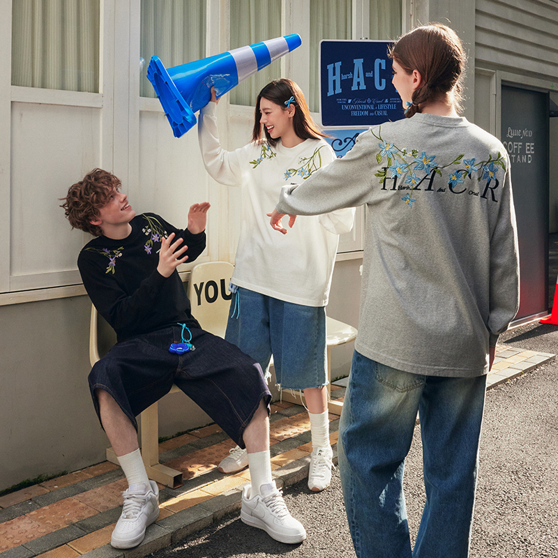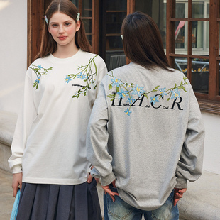 t恤男女 早秋国潮宽松慵懒感情侣装 HACR紫罗兰花卉刺绣长袖 t恤