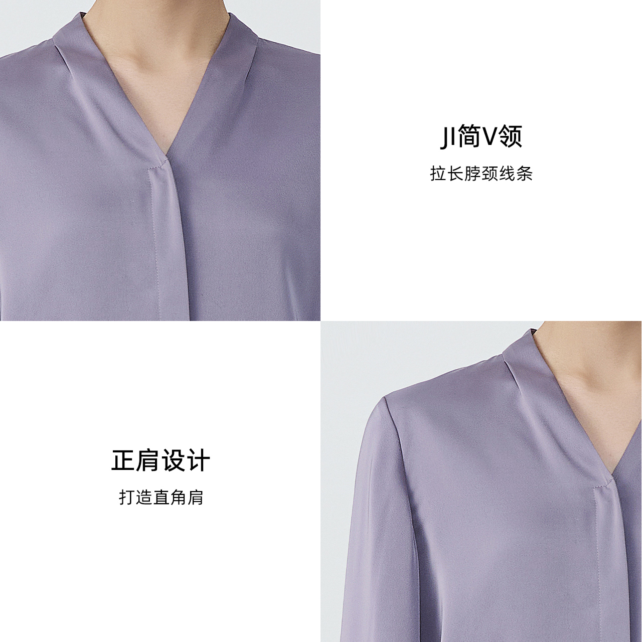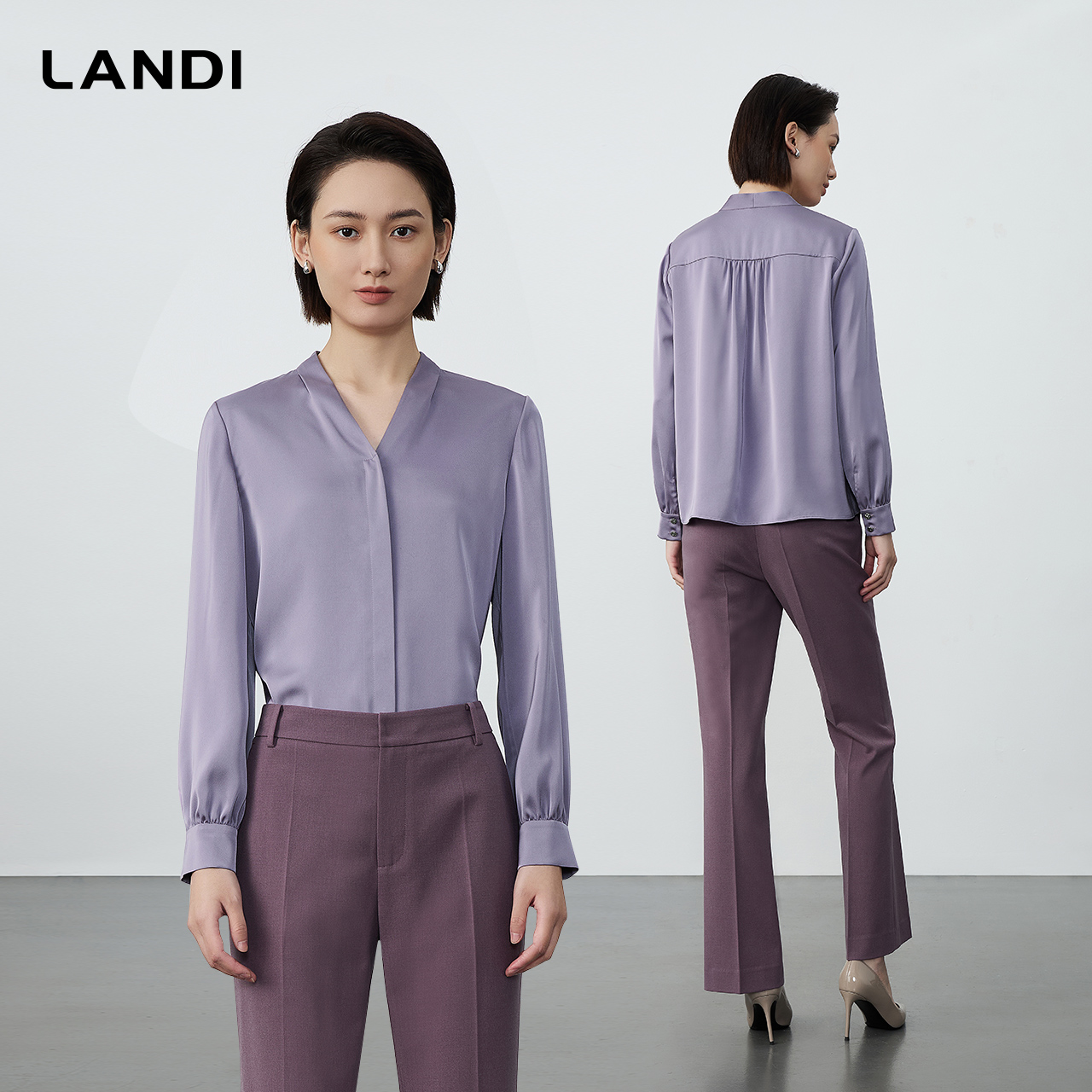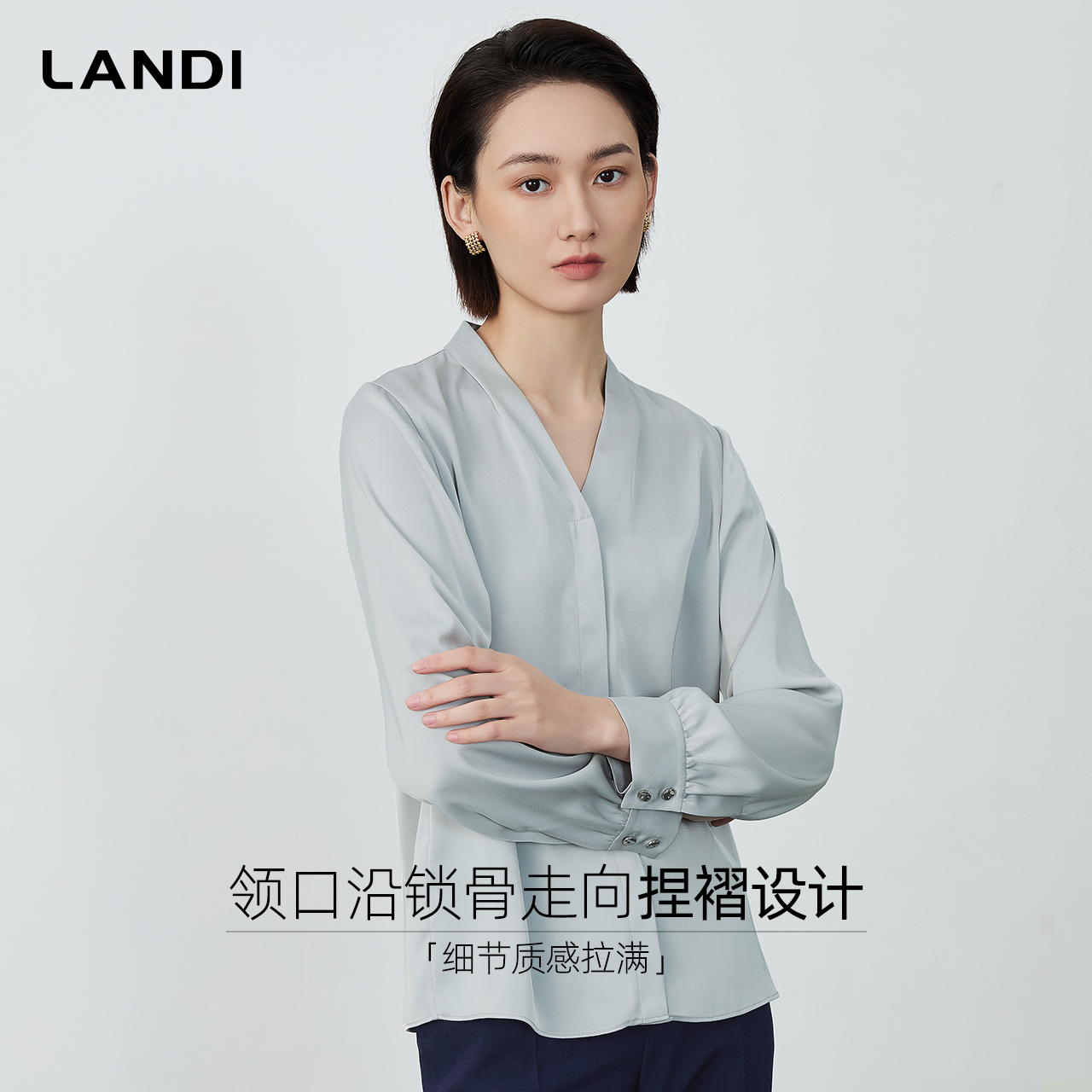 衬衫 LANDI高级感缎面V领暗扣通勤长袖 女上衣2025秋新品 气质通勤