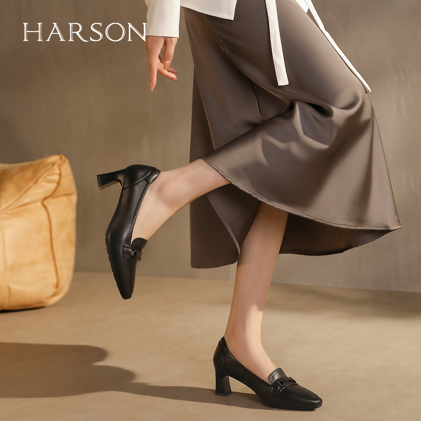 新品 哈森黑色浅口单鞋 2025秋季 职场通勤女鞋 HL257901 粗高跟乐福鞋