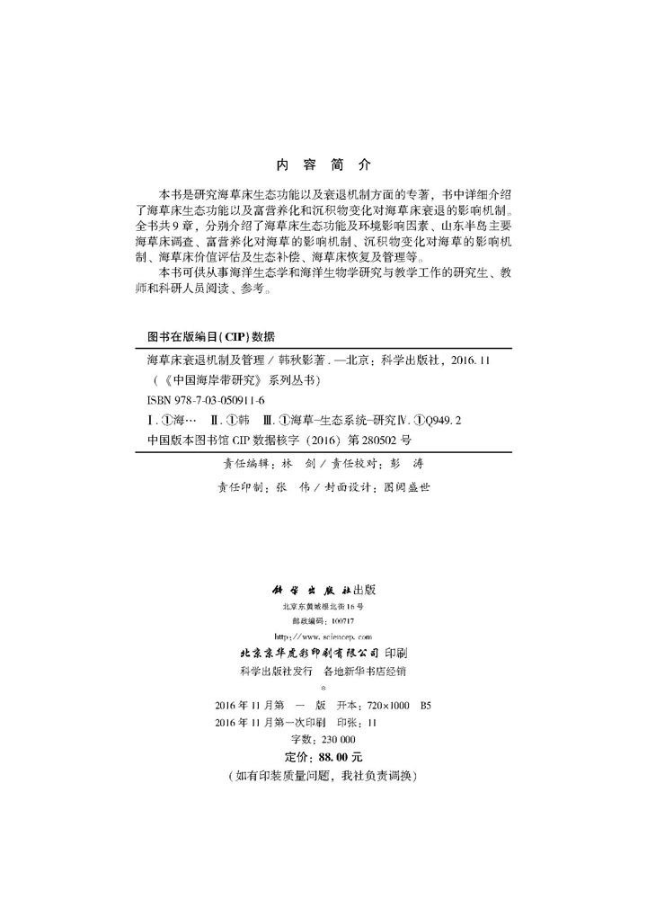 科学出版 正版 韩秋影著 海草床衰退机制及管理 社 现货