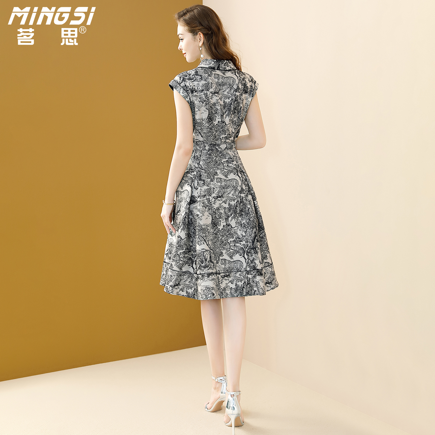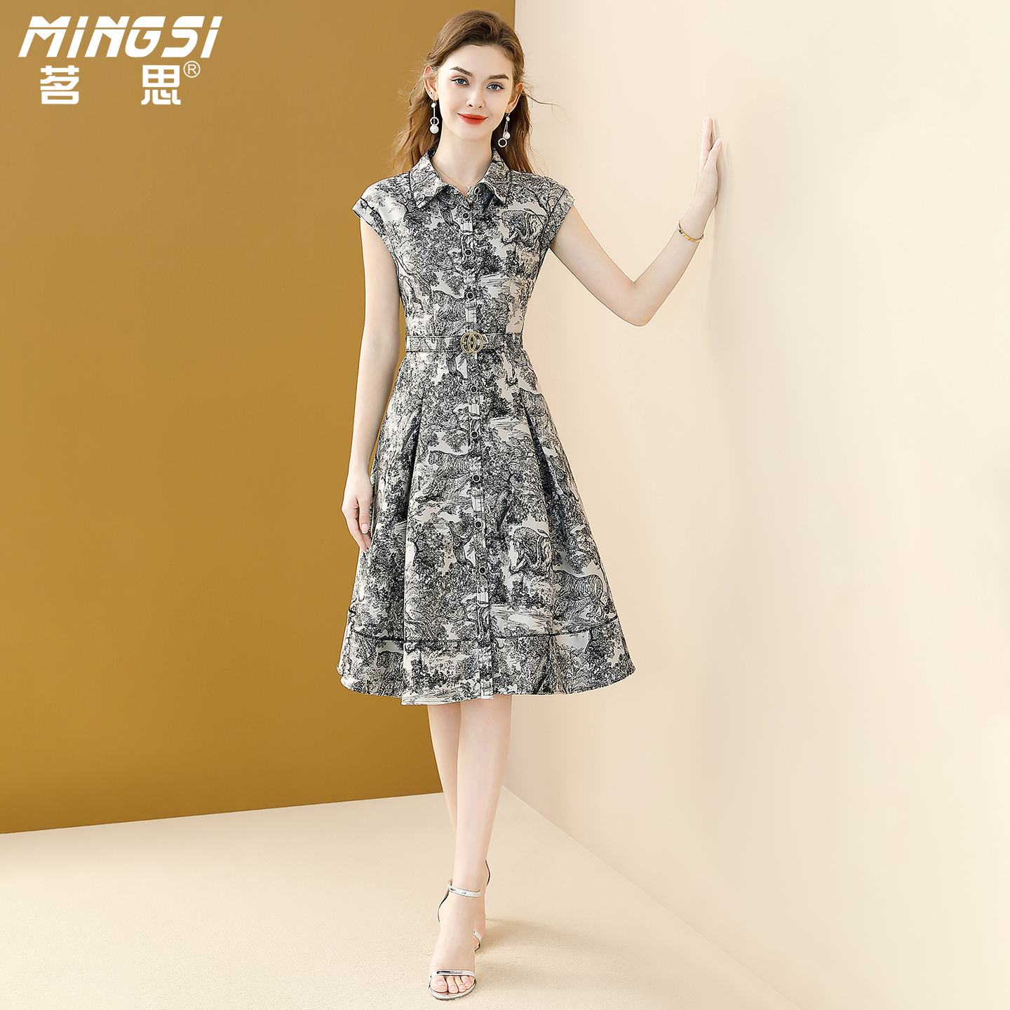 裙子 气质翻领收腰显瘦衬衫 茗思复古水墨提花连衣裙女2025夏季 新款