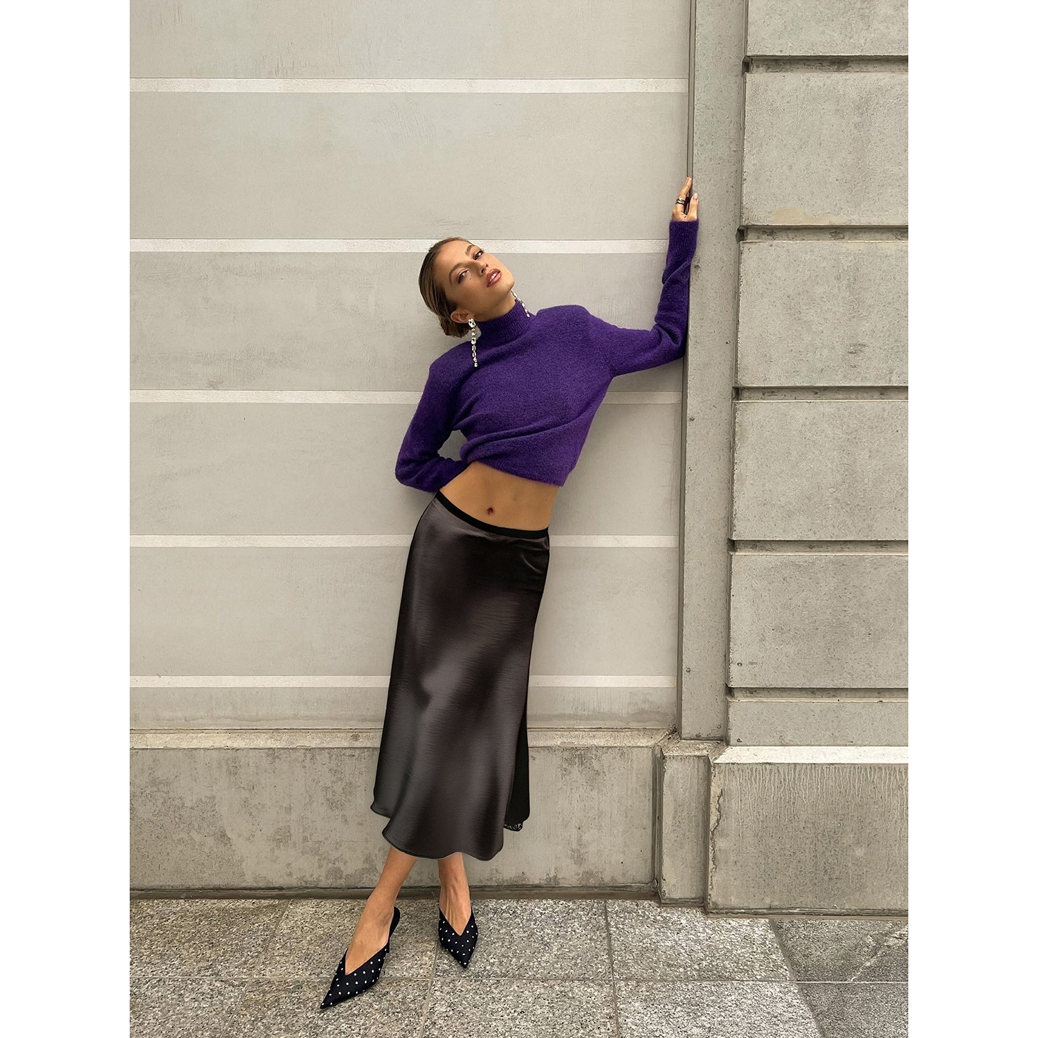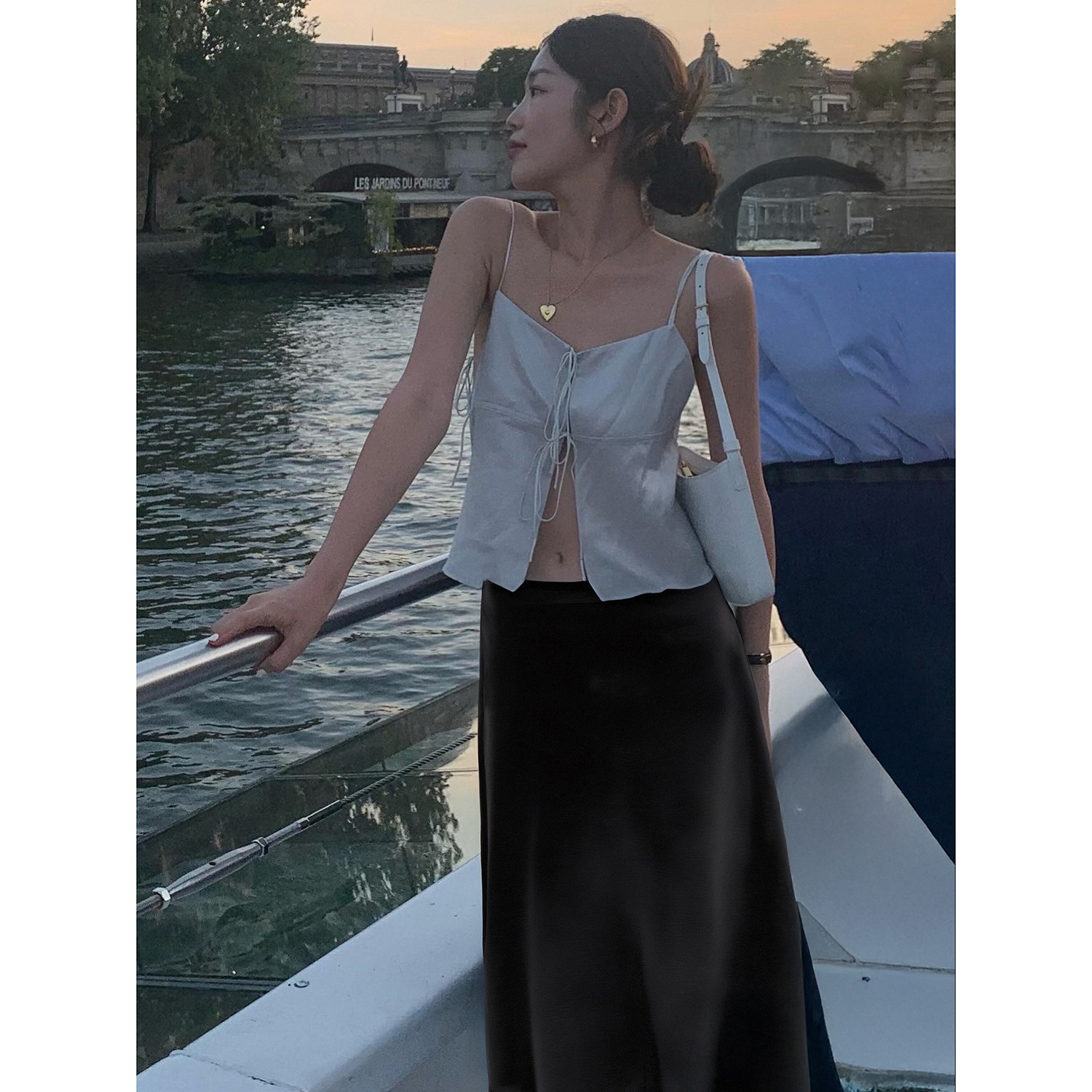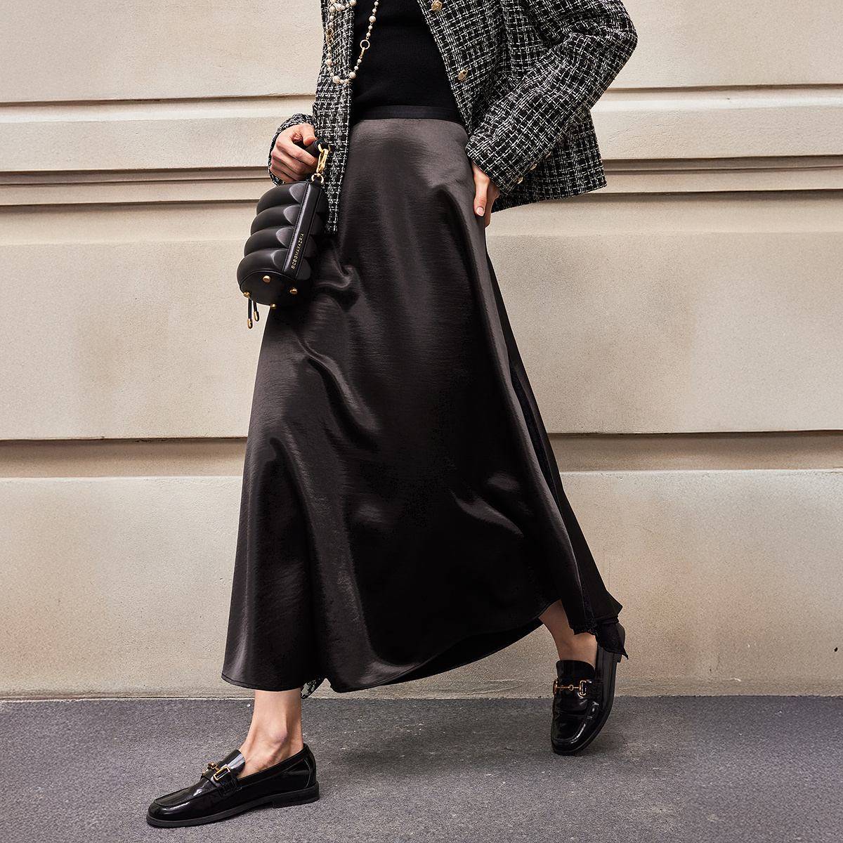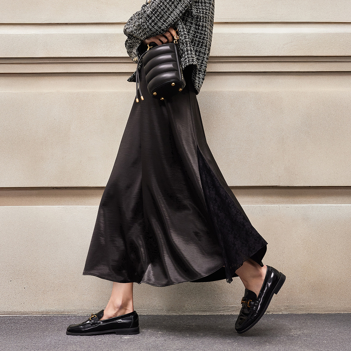 BCBG新款 半身裙女 早秋时髦精致范蕾丝气质下摆拼接缎面垂感长款