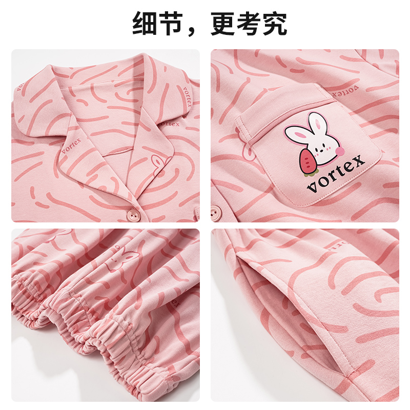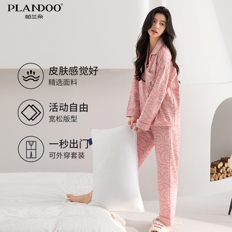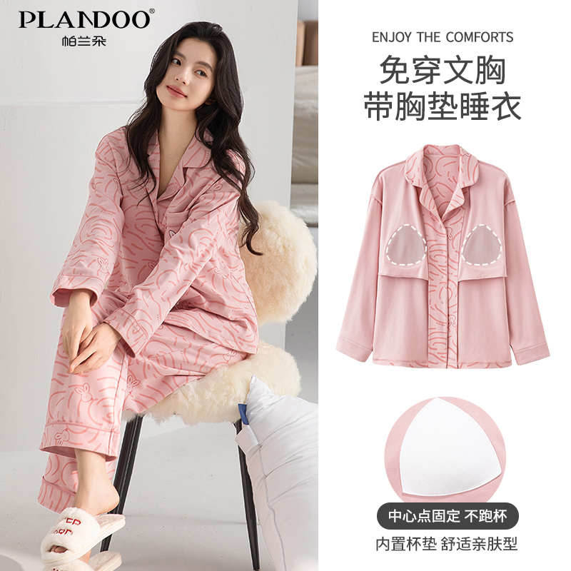 帕兰朵带胸垫睡衣女春秋棉长袖 家居服 免穿文胸两件套粉色甜美套装