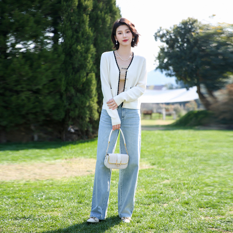 2025秋冬撞色设计显瘦毛衣外套 新款 水云间白色纯羊毛针织开衫 女装