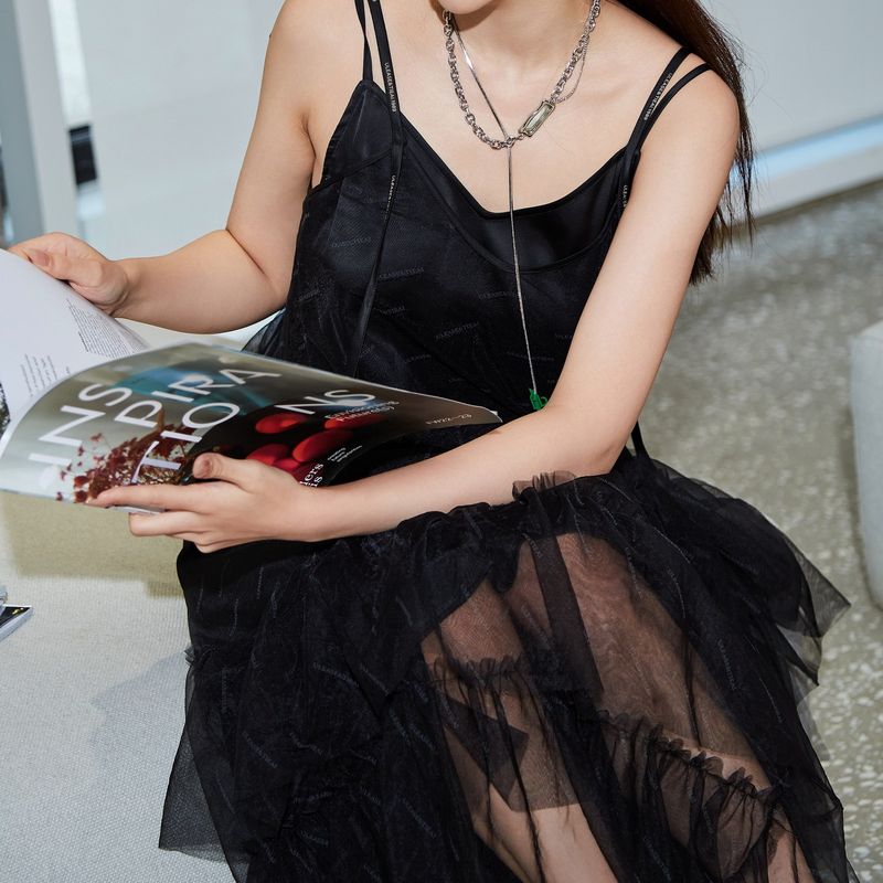 新款 百搭潮气质网纱裙尤缇2024春季 吊带裙女装 TI黑色不规则无袖