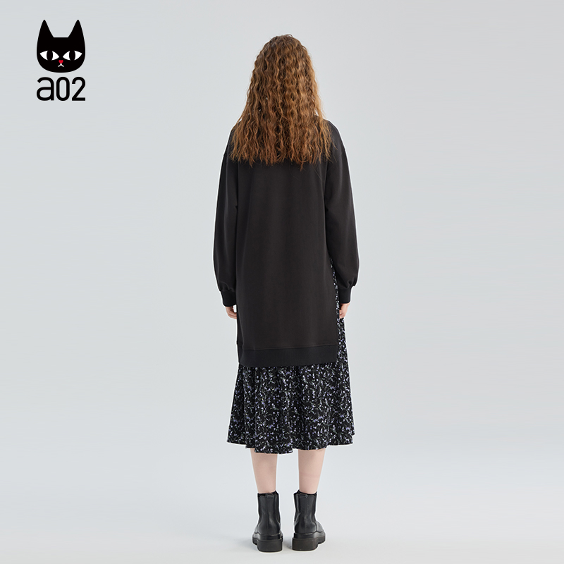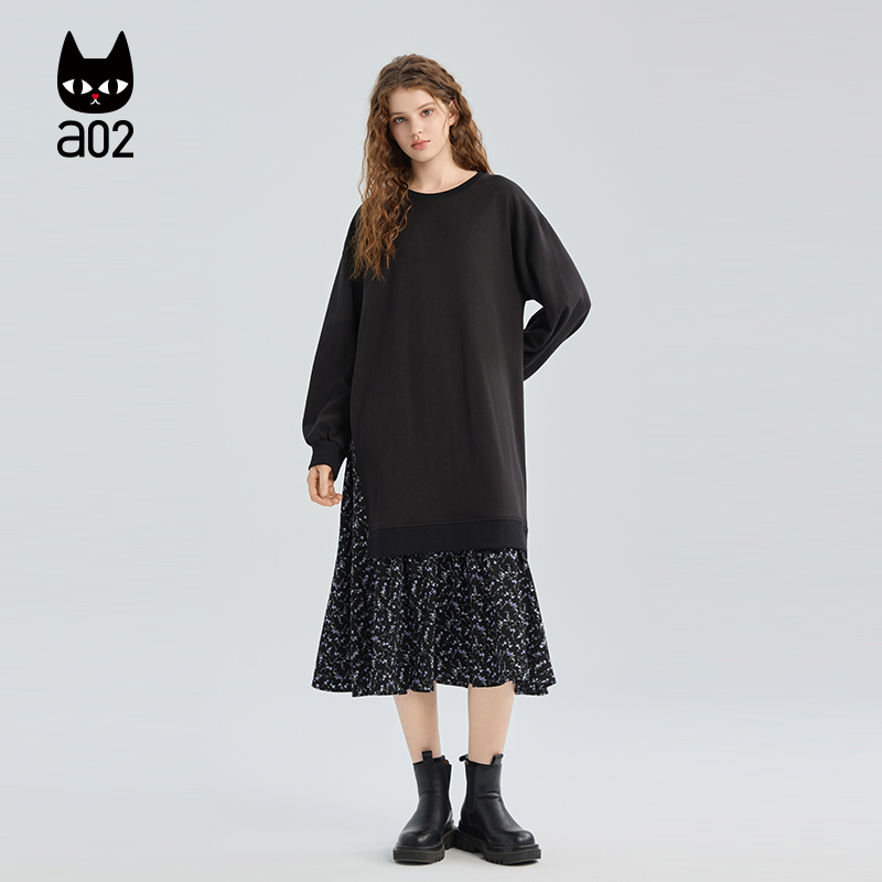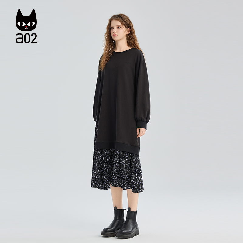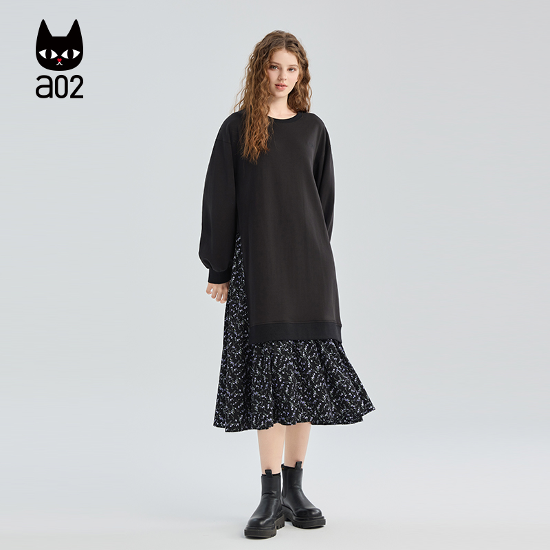 长裙 黑色裙子设计感秋装 a02假两件拼接碎花连衣裙女2025新款 秋季
