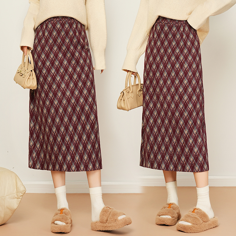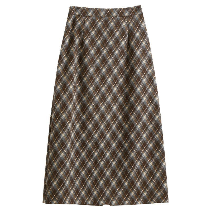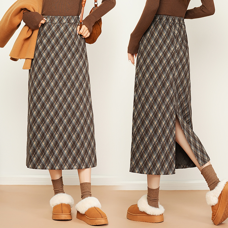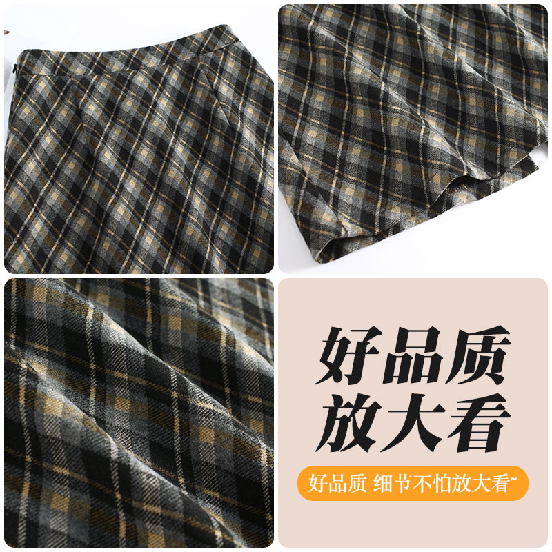 后开叉直筒裙子 高腰显瘦中长款 复古毛呢格纹半身裙女2025秋季 新款