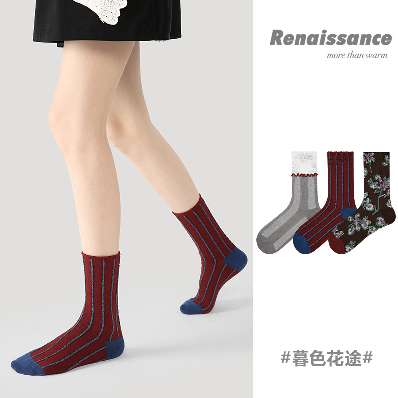 2025秋冬季 精梳棉假两件花边浮雕花卉中筒女袜 袜子女ins潮秋季