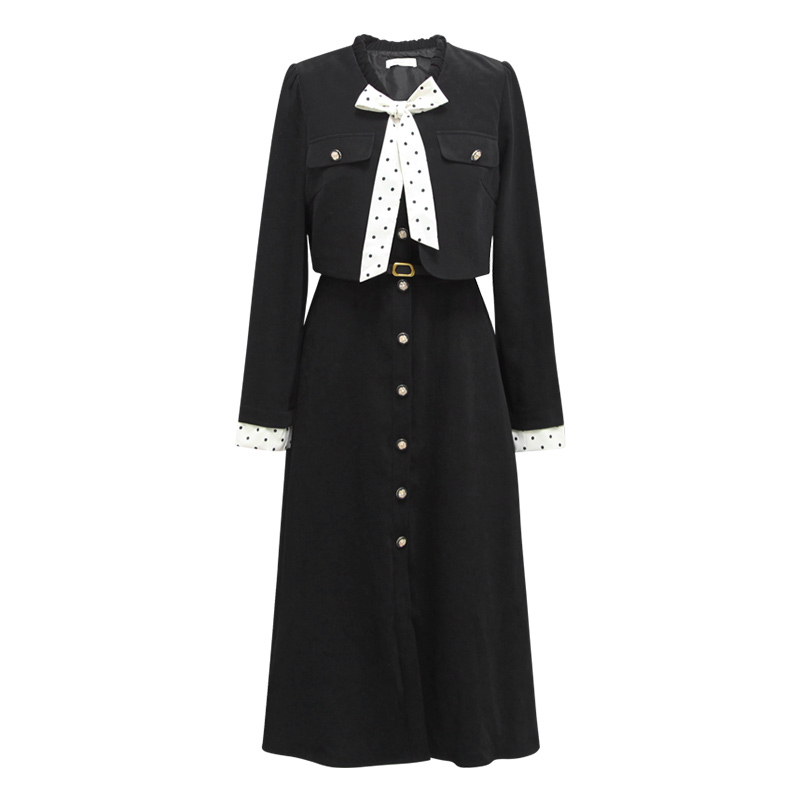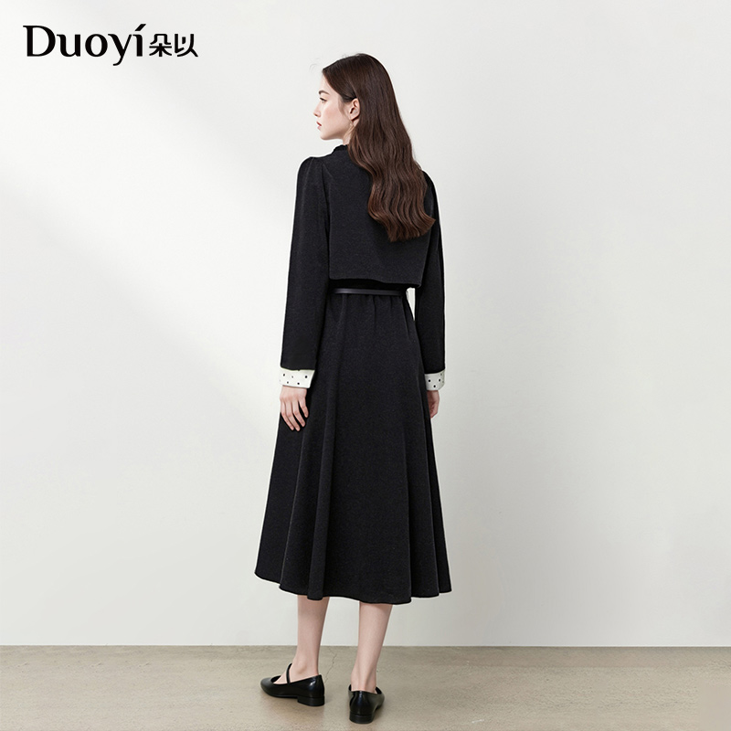 连衣裙 复古千金风波点飘带V领假两件黑色长袖 朵以2025秋季 新款