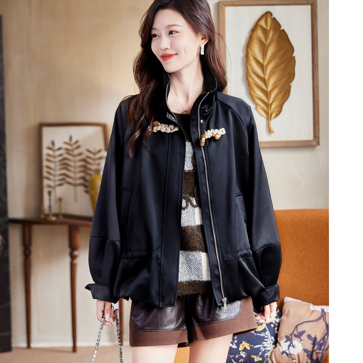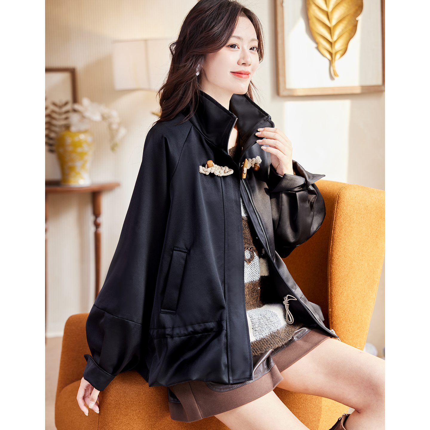 女装 休闲慵懒百搭大码 上衣 时尚 宝诗黎小立领宽松收腰外套2025秋季
