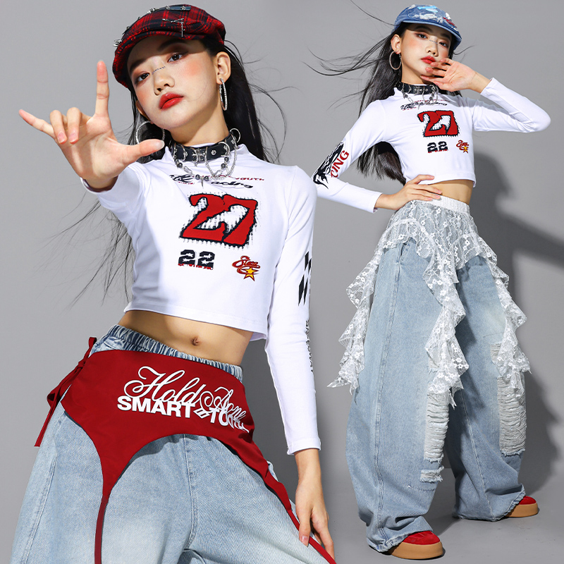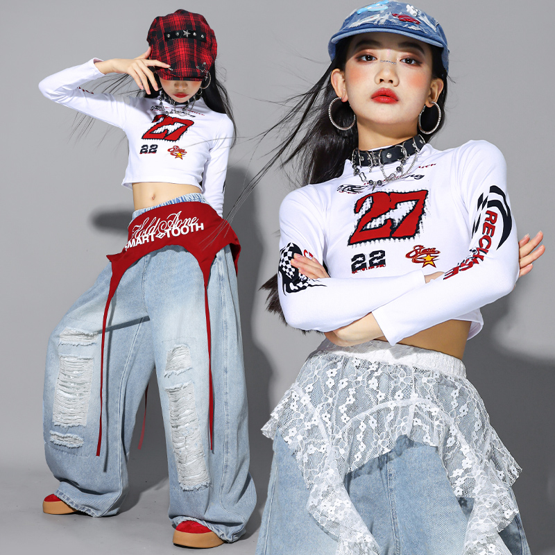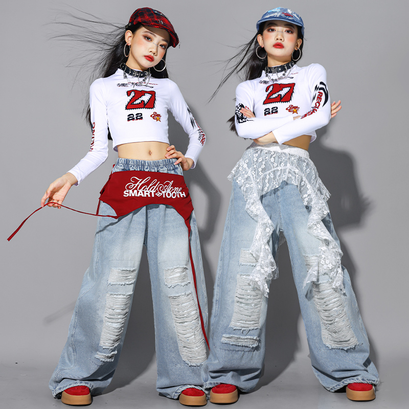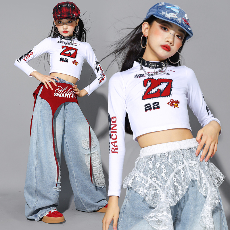 女孩走秀套装 子潮装 少儿牛仔裤 女童jazz爵士舞演出服儿童街舞服装
