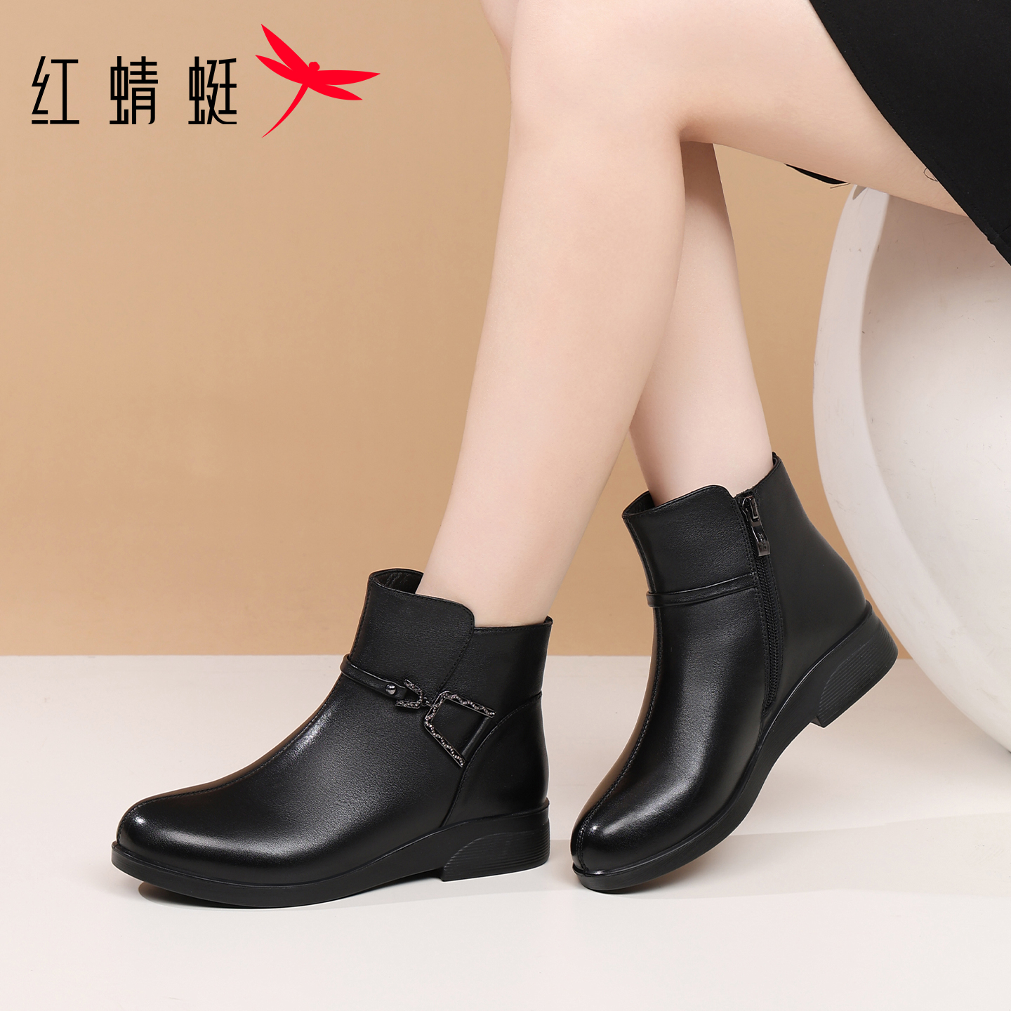 女士靴子女短靴秋冬真皮加绒保暖妈妈皮靴高帮棉鞋 红蜻蜓冬季 女鞋