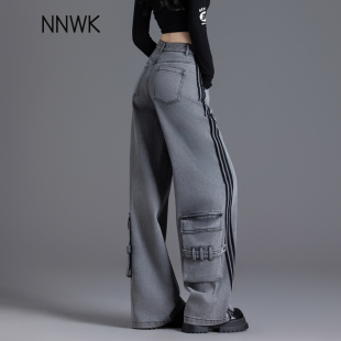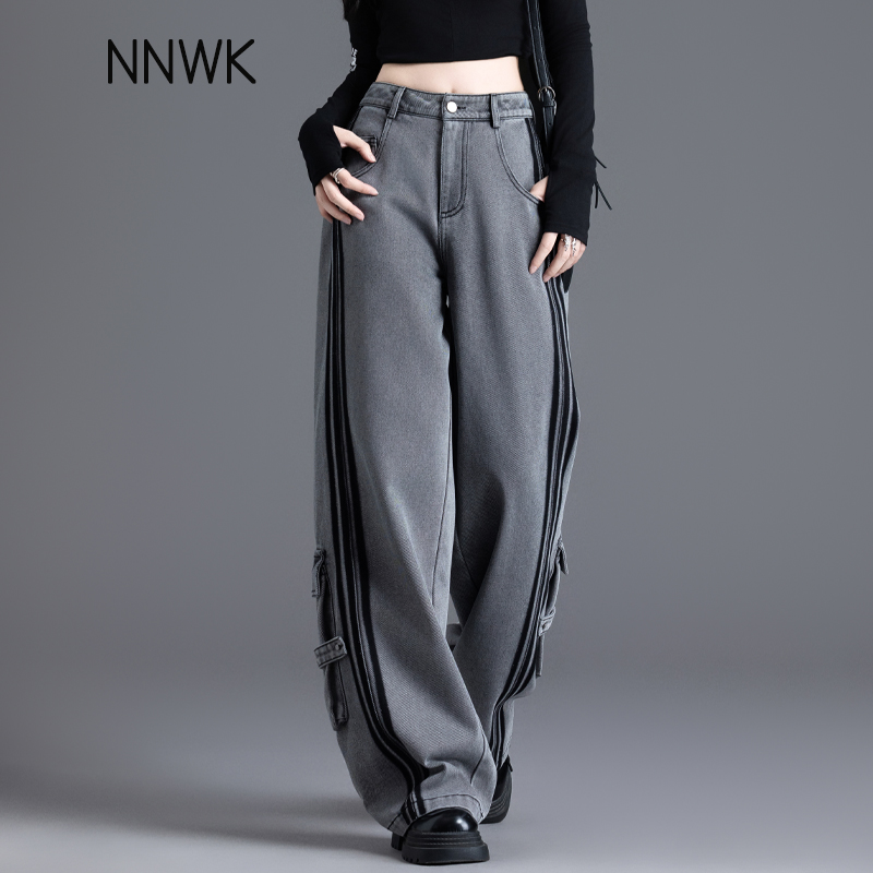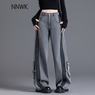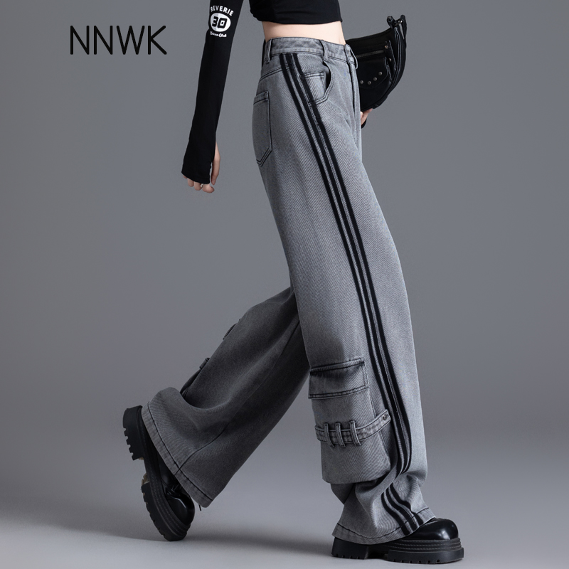 子秋季 侧边条纹工装 裤 黑色牛仔裤 长裤 超火裤 直筒阔腿裤 女2025新款