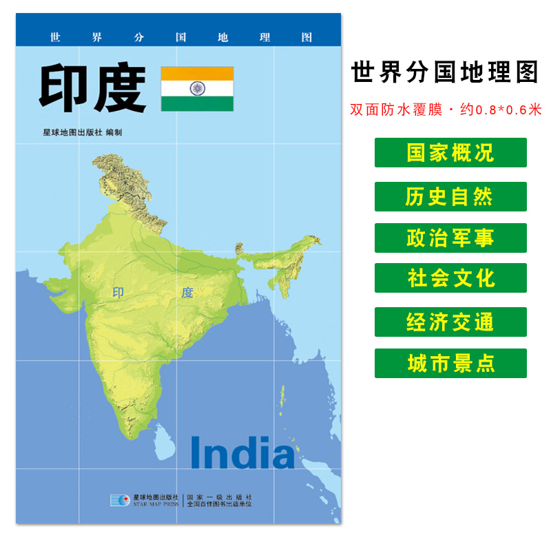 政区图 印度地图 社 约84 折叠袋装 印度 60cm 人文历史 地理概况 星球地图出版 城市景点 双面覆膜防水 世界分国地理图