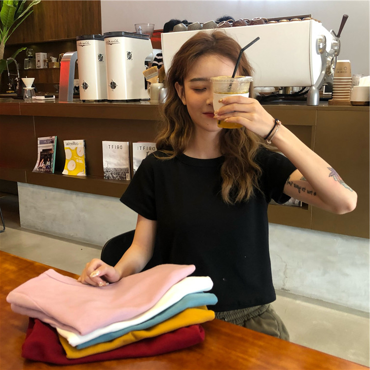 高腰网红短袖 上衣配高腰裤 t恤女ins潮超火 露脐泫雅风短款 纯色修身
