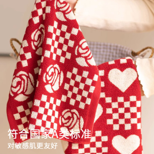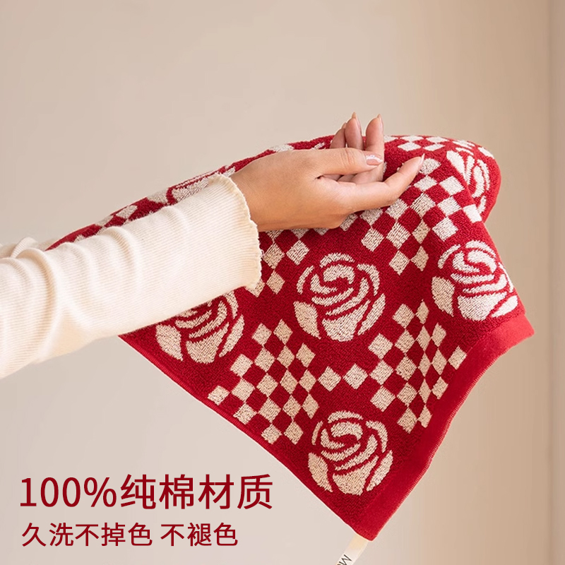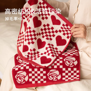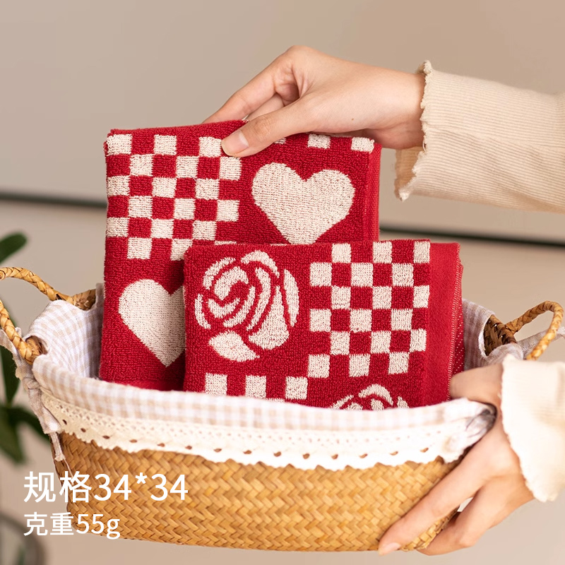 棋盘格爱心方巾纯棉方巾复古红色中式 简约浪漫居家柔软亲肤面巾