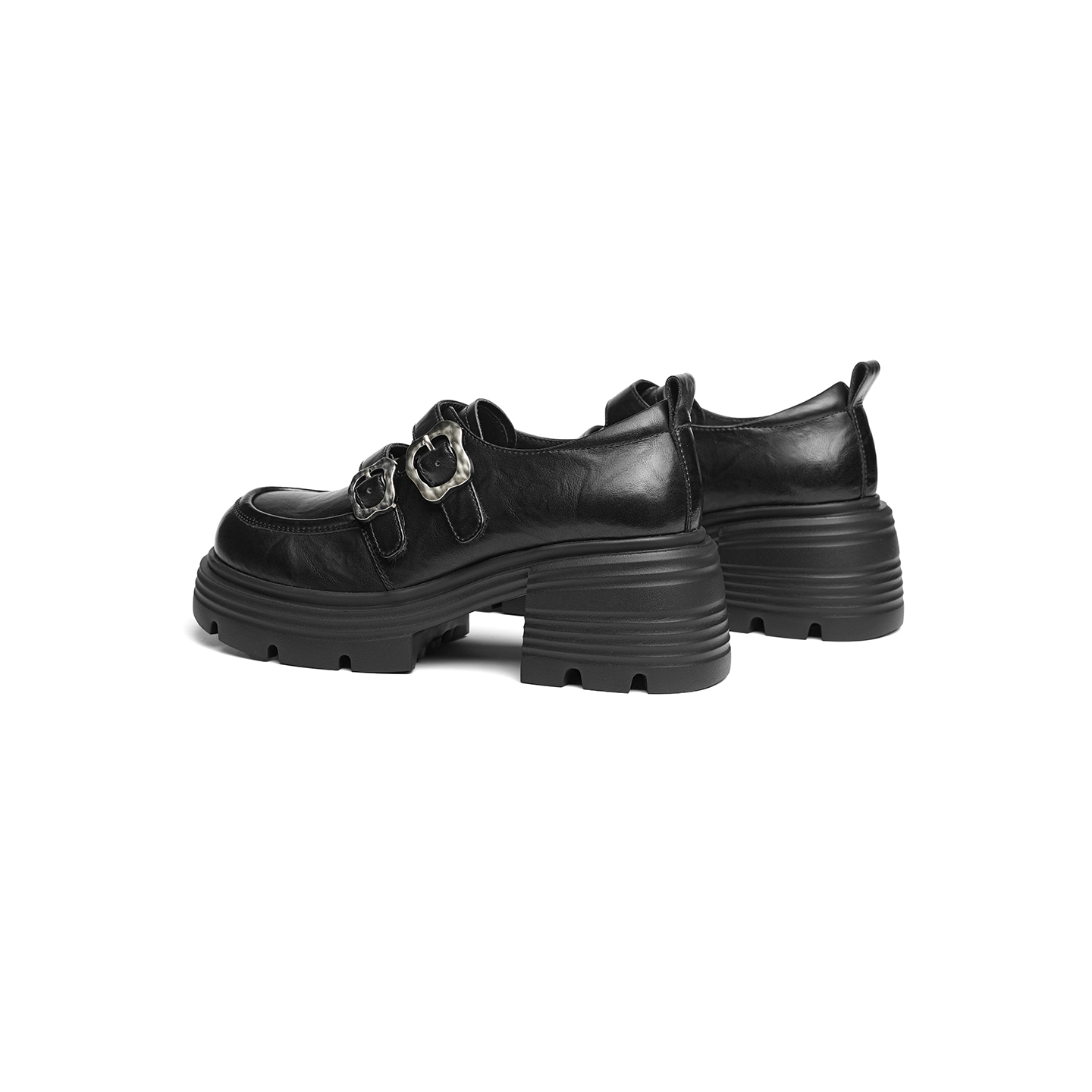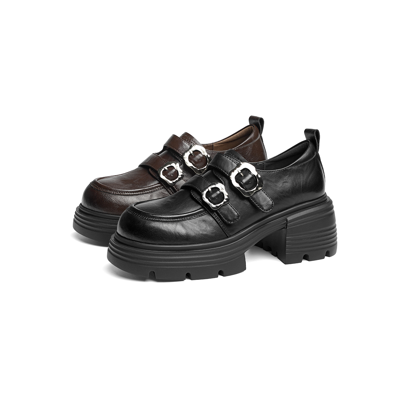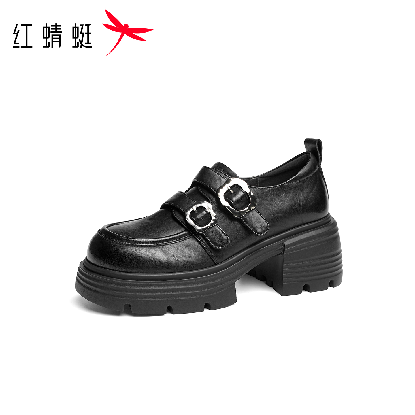 女2025秋季 英伦增高黑色皮鞋 新款 粗跟松糕鞋 女鞋 红蜻蜓厚底乐福鞋