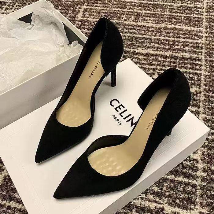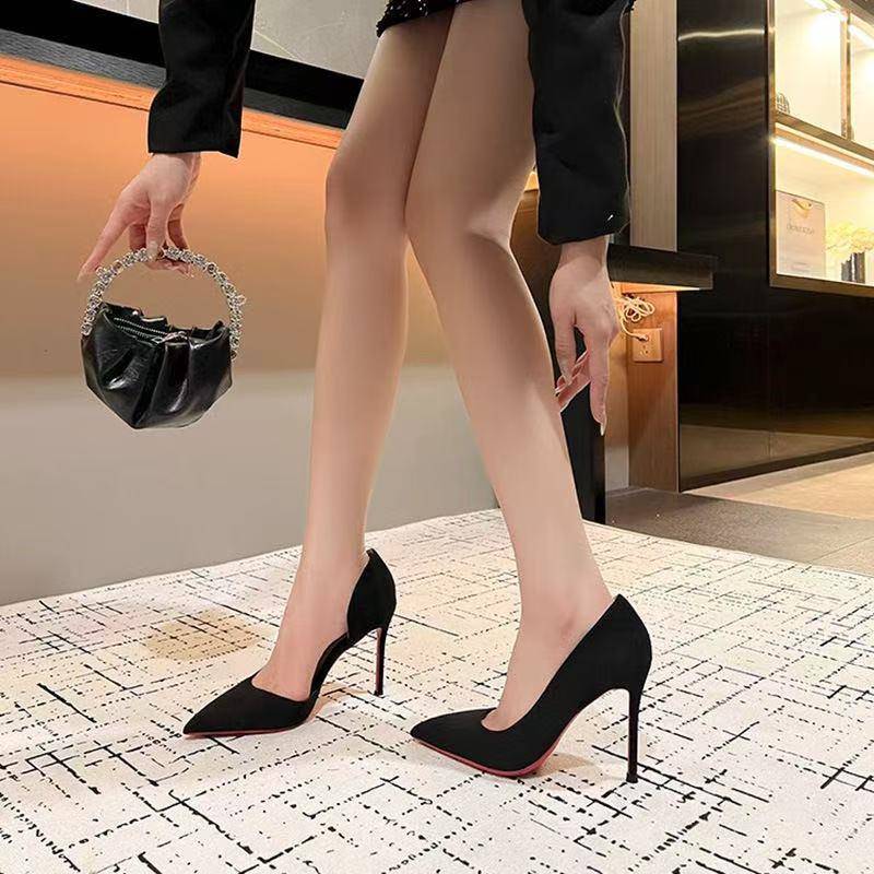 黑色侧空绒面10cm高跟鞋 女小众洋气百搭红底细跟小众尖头浅口单鞋