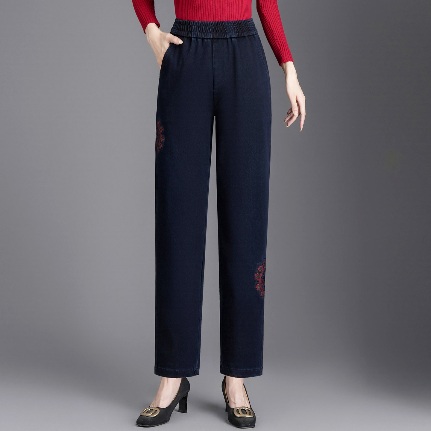 烫钻高腰棉喇叭裤 MISSCOCOON可可尼深蓝色牛仔裤 女2025秋冬新款