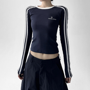 复古三条杠撞色刺绣T恤女修身 美式 设计感运动风上衣 新款 2025秋季