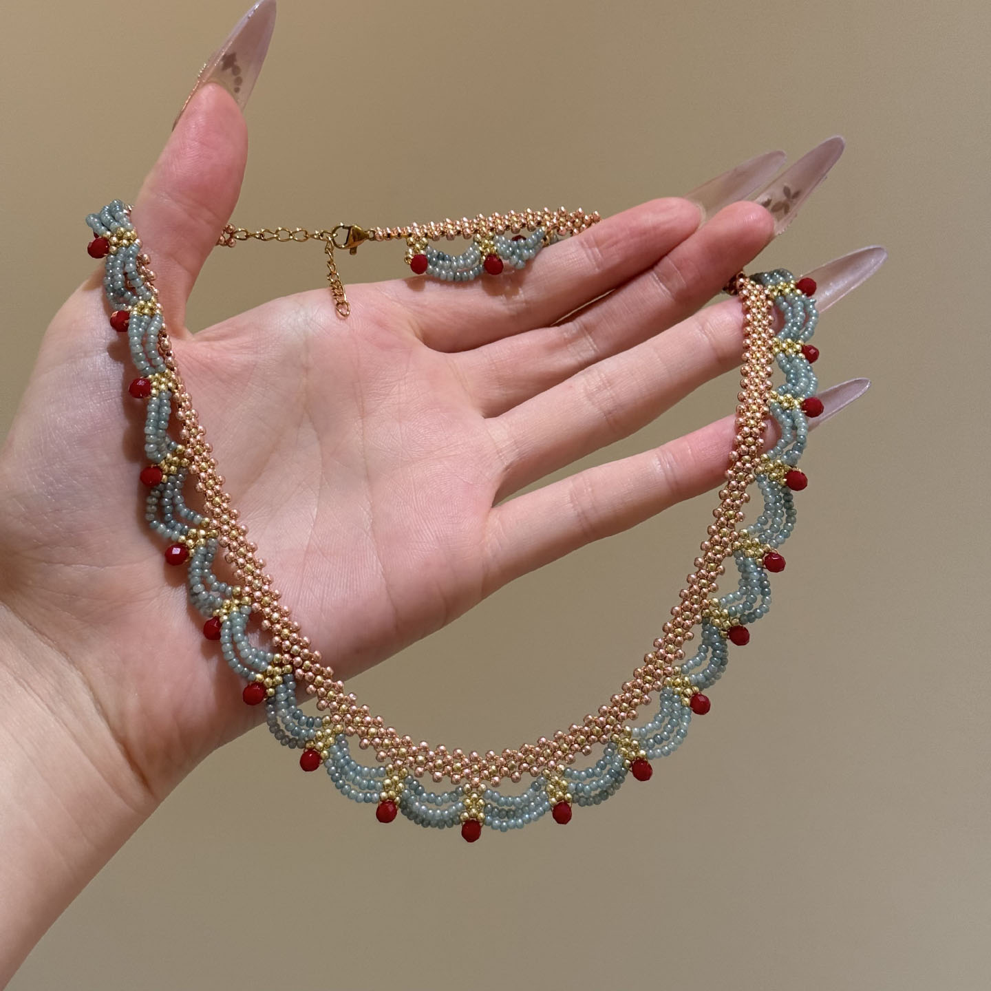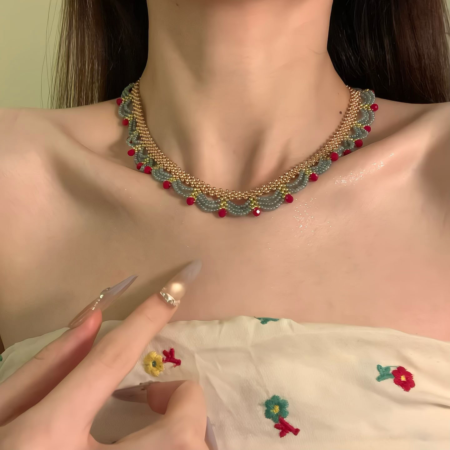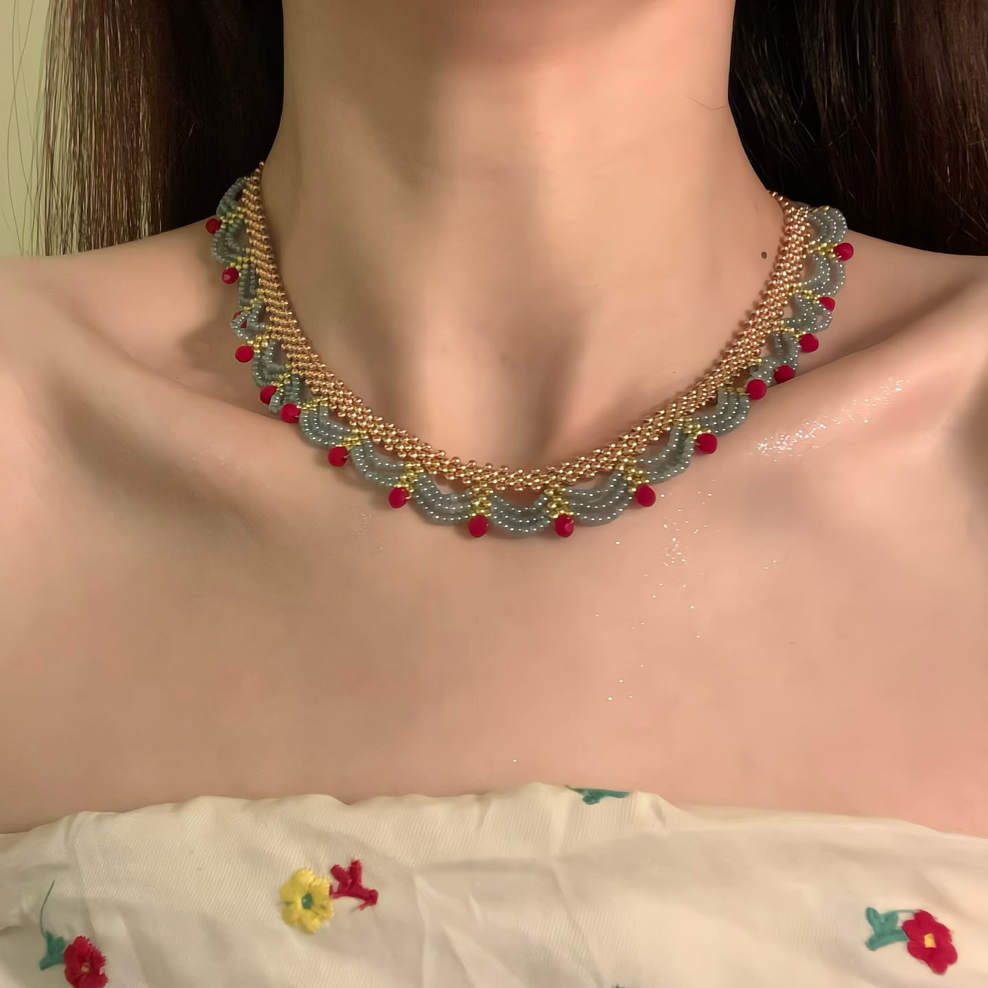 楼兰少女 红蓝撞色串珠项链复古国风气质锁骨链颈链拎环女 新中式