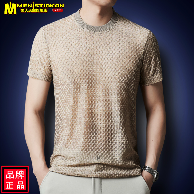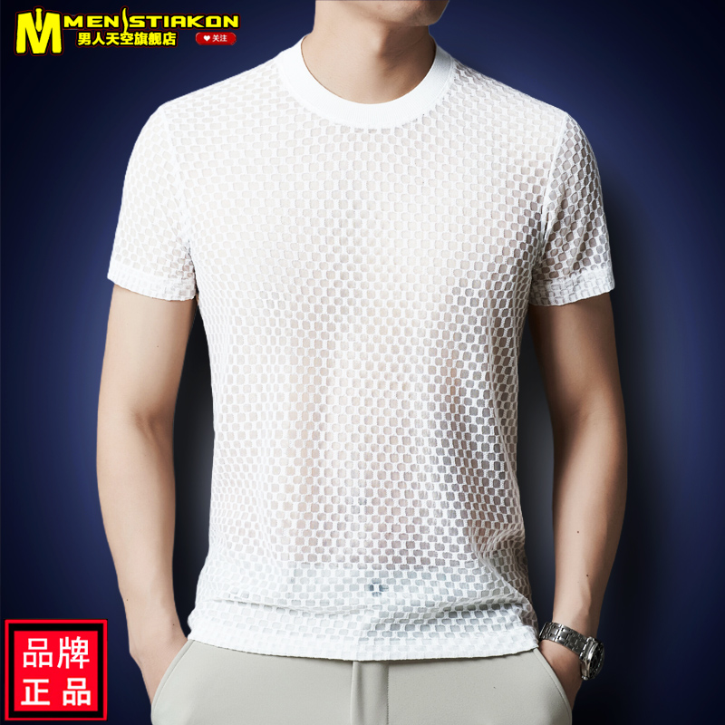 时尚 夏季 t恤男修身 薄冰丝短袖 潮流休闲网格透气弹力圆领镂空 男士