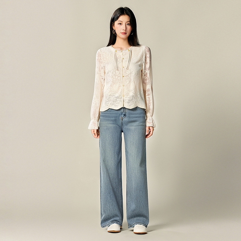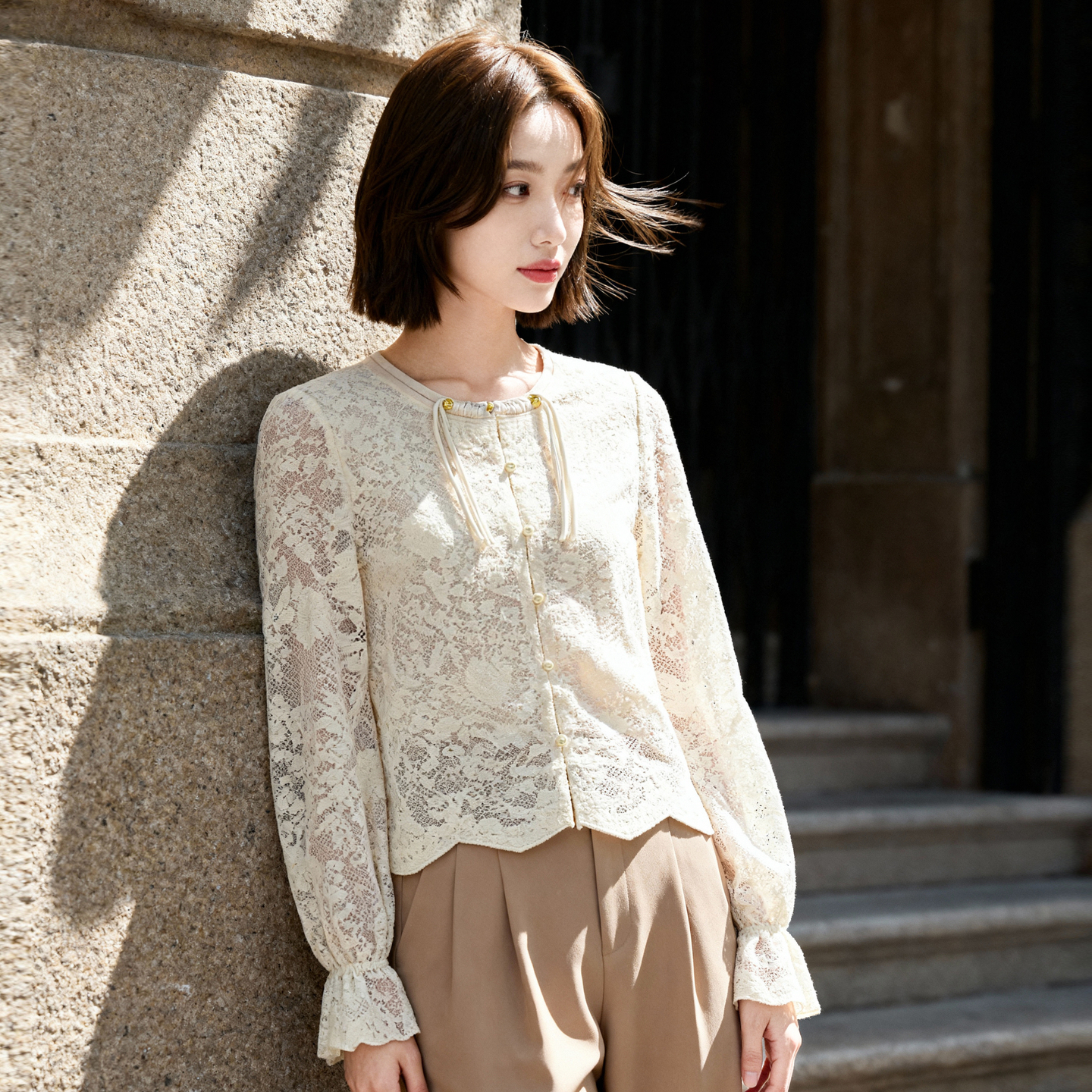House 开衫 百家好法式 女甜美风花边泡泡袖 上衣 镂空雕花衬衫 Basic