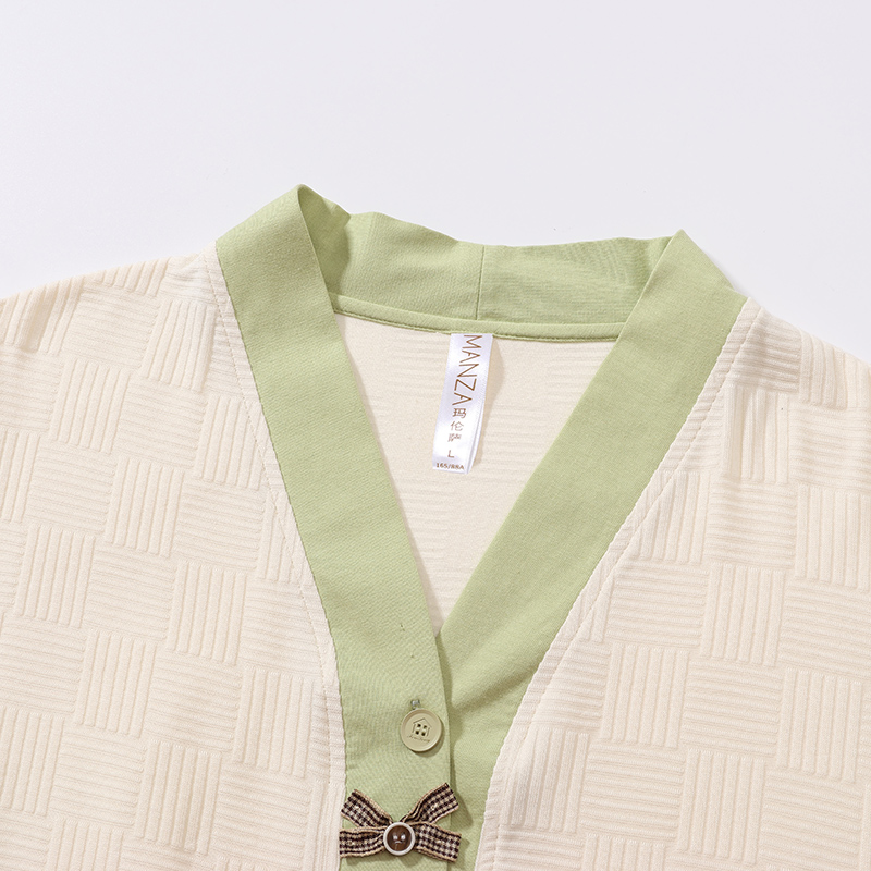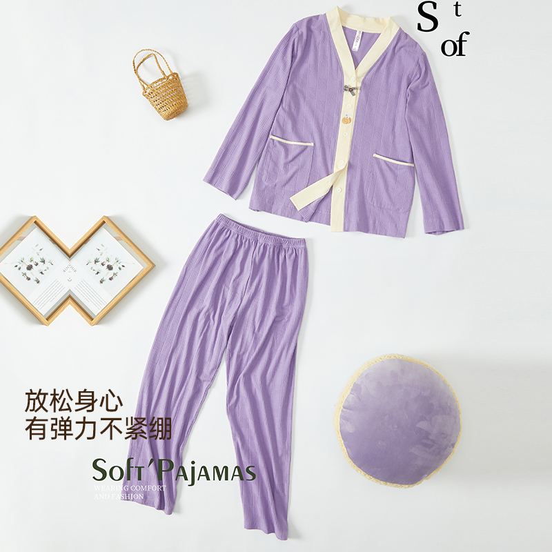 新款 套装 V领开衫 长裤 家居服长袖 玛伦萨纯棉睡衣女柔软高弹春秋季