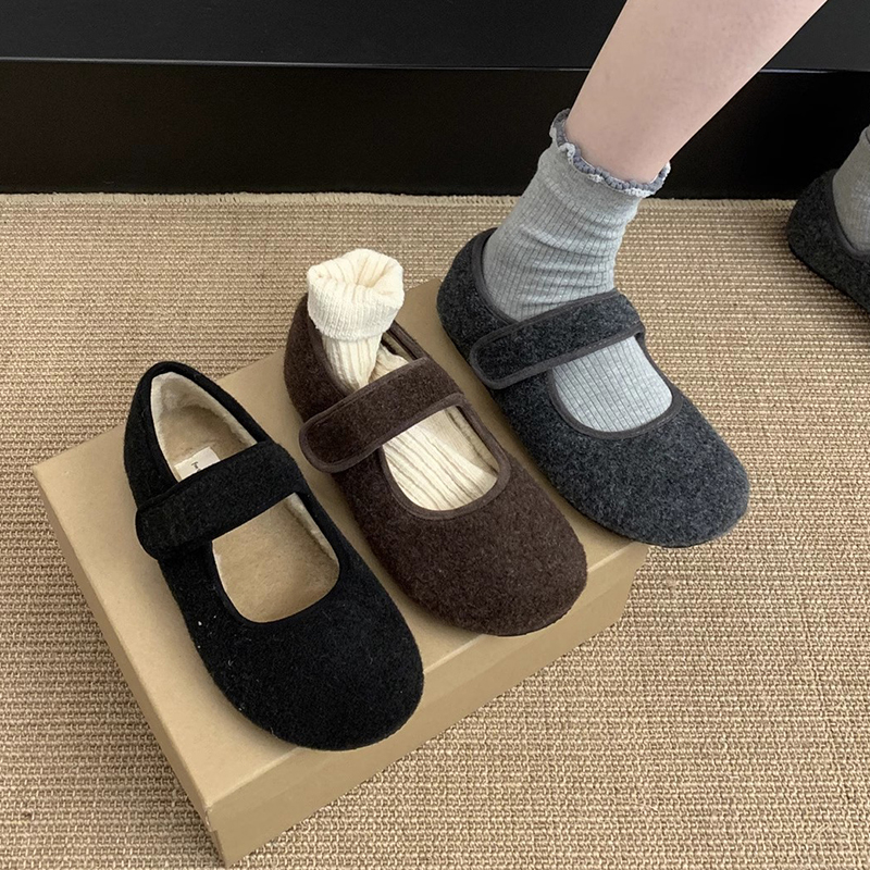平底玛丽珍豆豆鞋 魔术贴灰色毛毛鞋 保暖棉鞋 加绒单鞋 女冬外穿新款