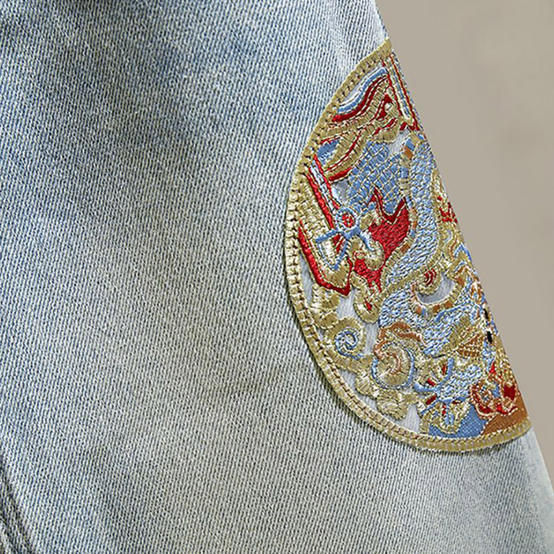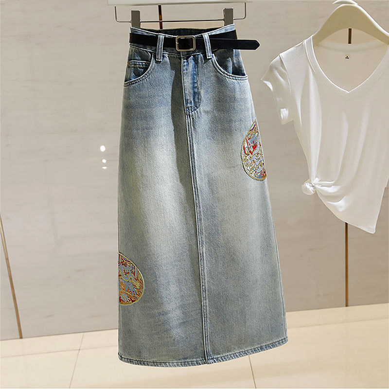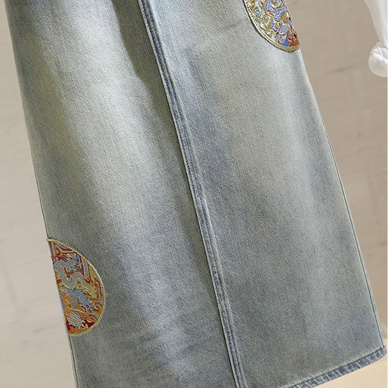 后开叉中长款 刺绣复古高腰显瘦A字包臀裙 牛仔半身裙2024春夏新款