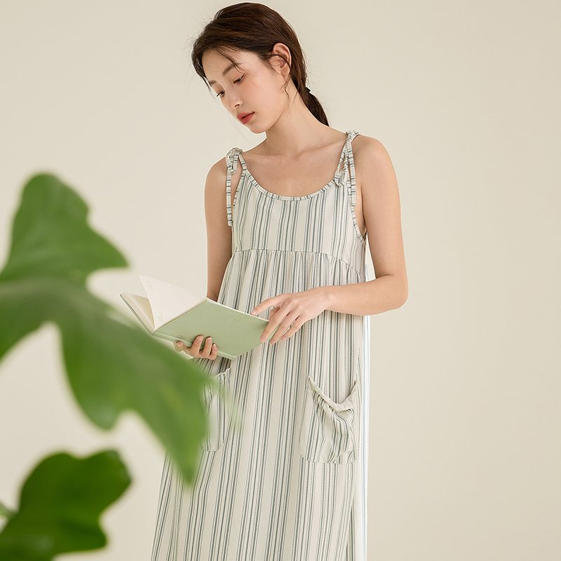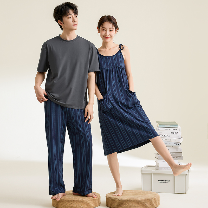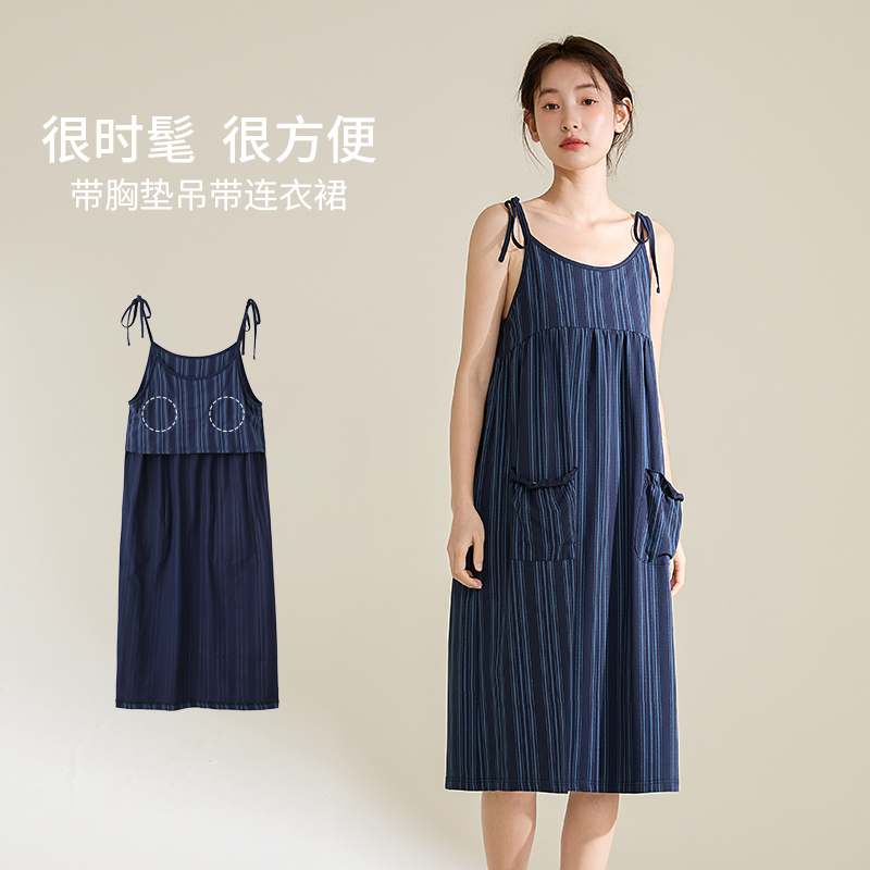 大码 长裙家居服夏款 条纹休闲可外穿 纯棉短袖 悦内睡裙女士睡衣夏季