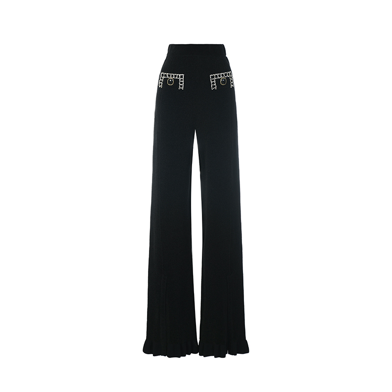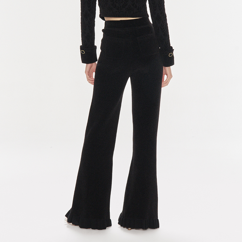 lefame拉飞姆秋季 优雅宫廷风黑色针织高腰微喇长裤