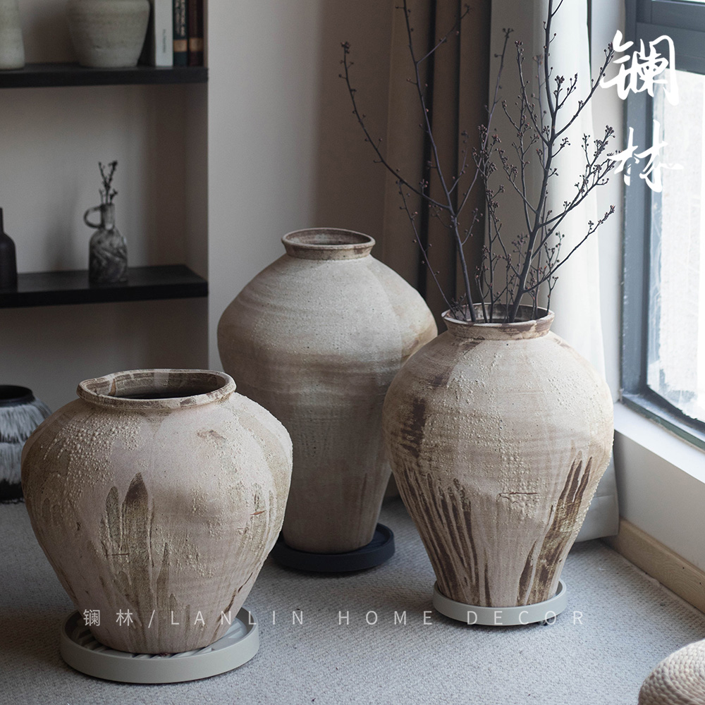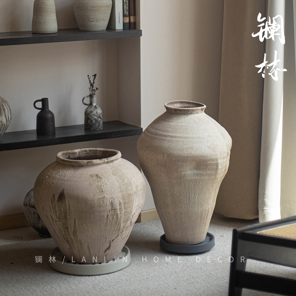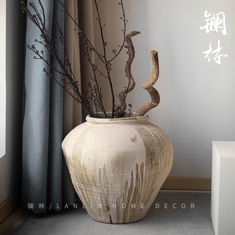 景德镇复古落地花瓶侘寂风禅意粗陶罐餐厅客厅民宿插干花装 饰摆件