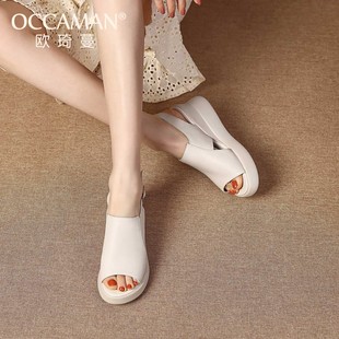 软底舒适真皮坡跟高跟鞋 松糕厚底鱼嘴凉鞋 增高女鞋 新款 女2024夏季
