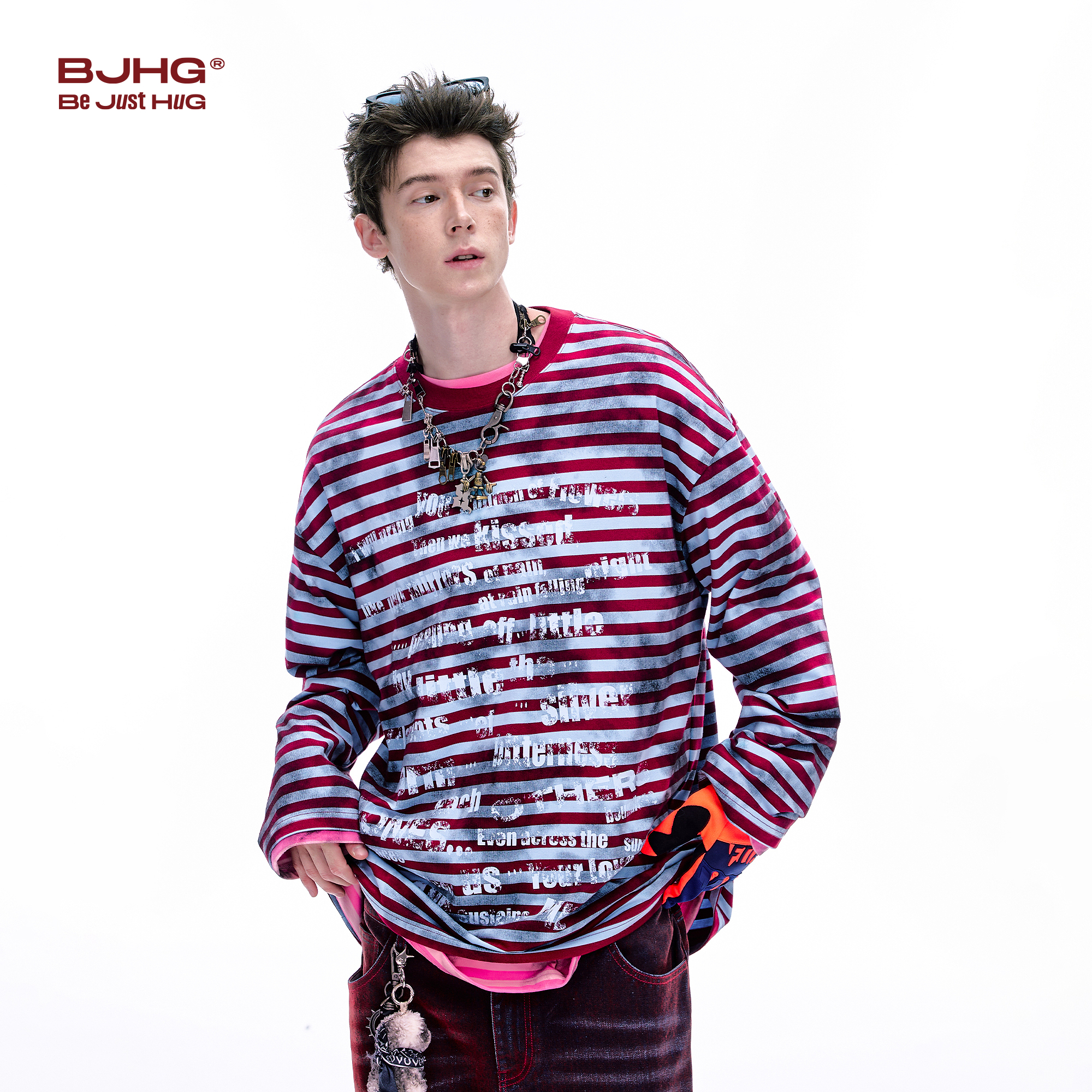 T恤男款 打底衫 秋季 美式 上衣卫衣女 新款 BJHG不计后果条纹情侣长袖
