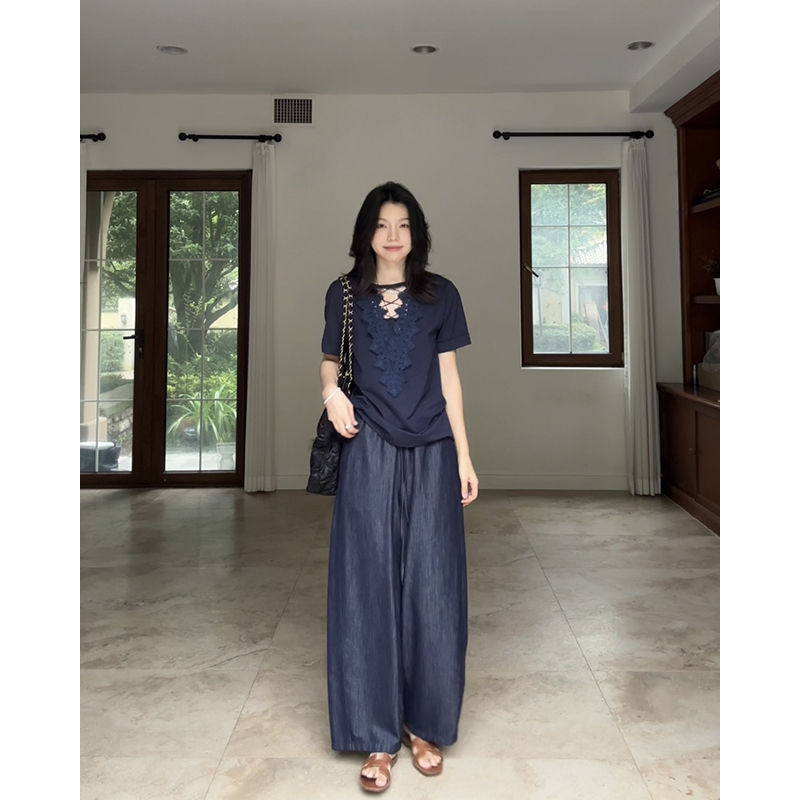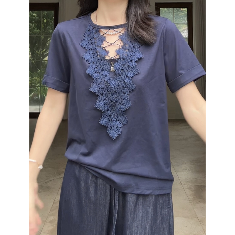 设计感上衣百搭休闲气球裤 郭九九呢棉质气质镂空花边短袖 T恤夏季