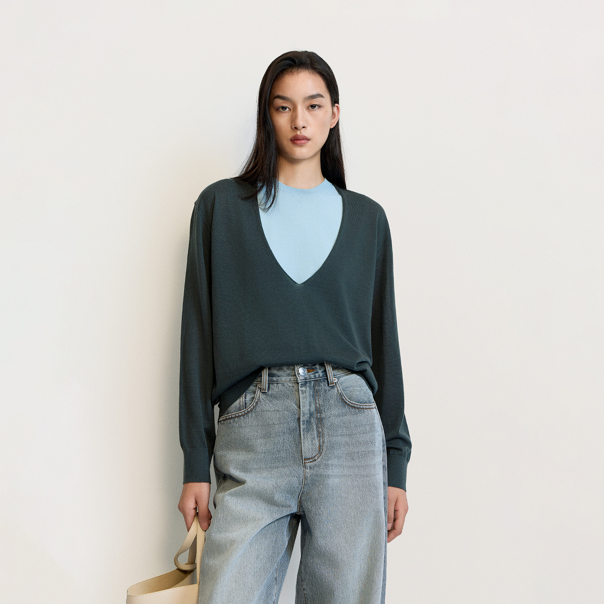 OCHIRLY欧时力 100%澳大利亚羊毛V领毛衣女慵懒松弛2025早秋新品