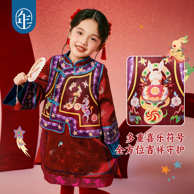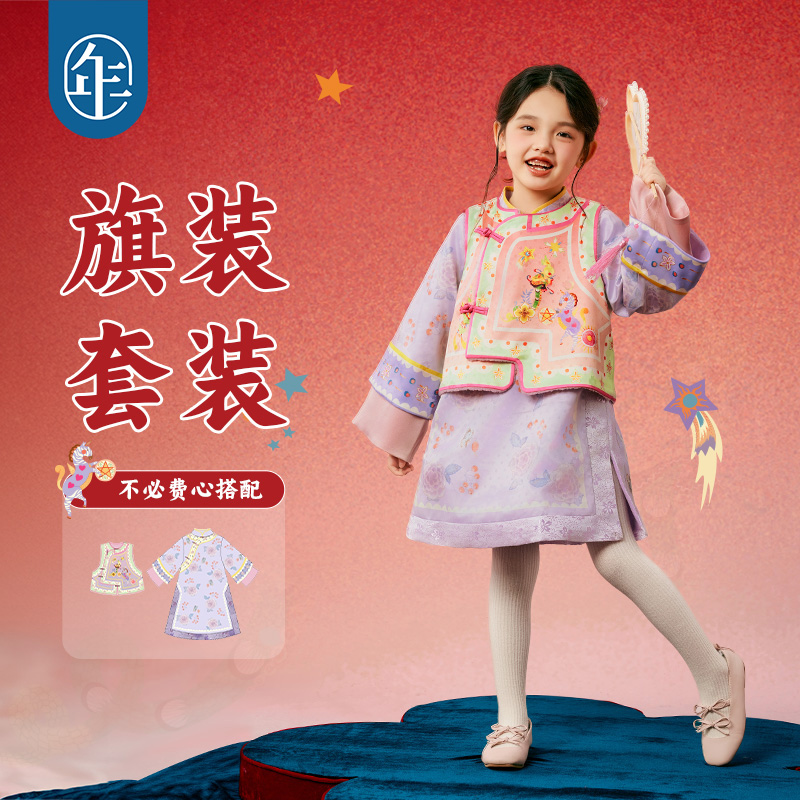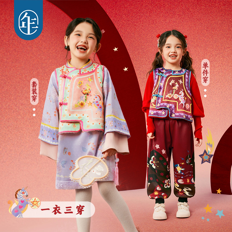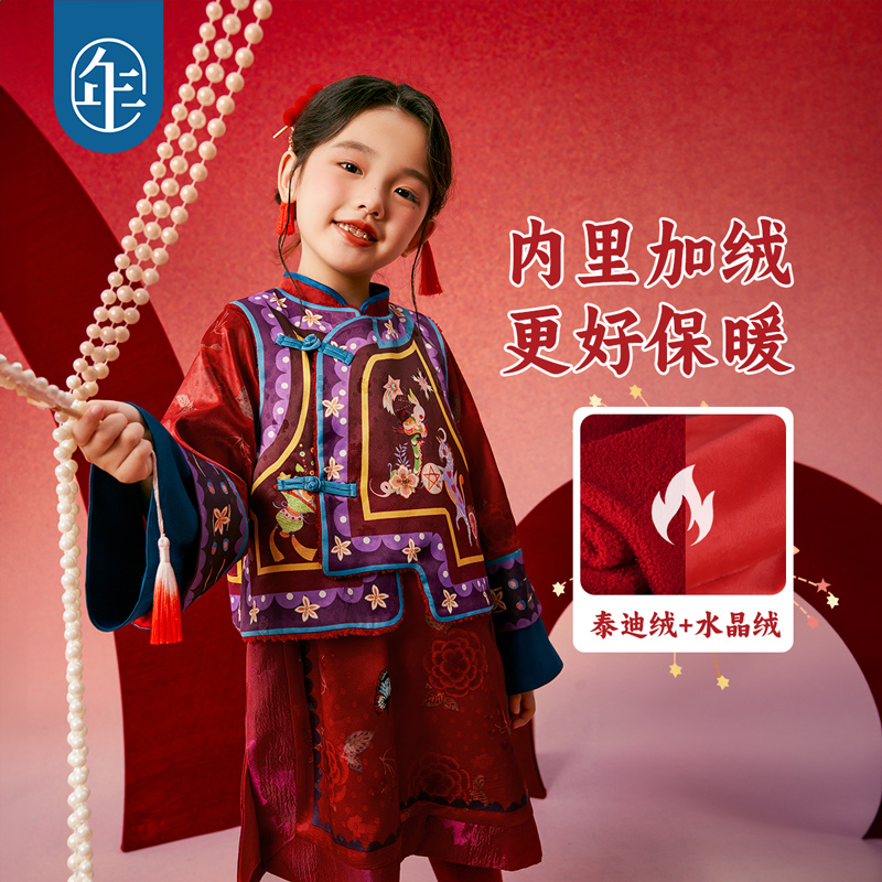汉服中式 年衣童装 唐装 冬款 儿童改良旗袍马甲拜年服演出服 女童套装