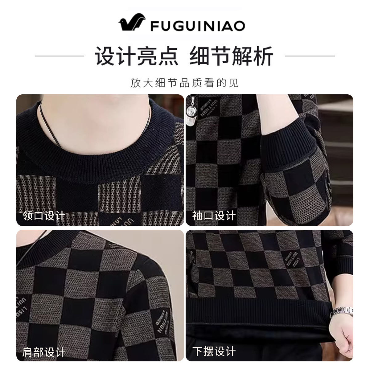 新款 2025年秋季 格子上衣服休闲卫衣男T秋冬 t恤男士 富贵鸟圆领长袖