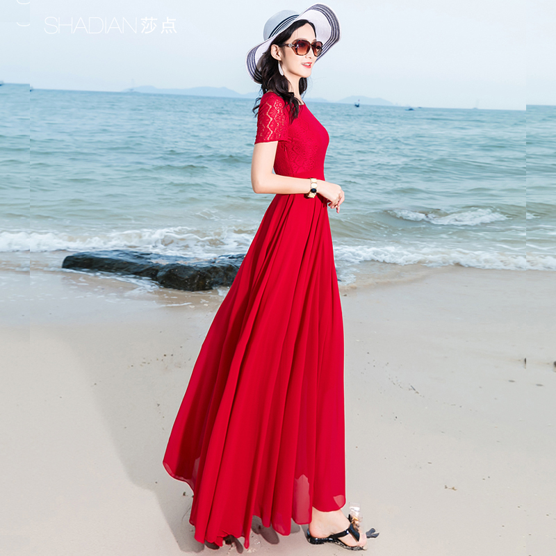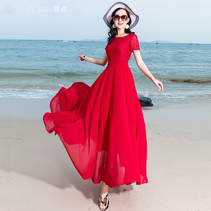 波西米亚大摆连衣裙女夏雪纺长款 红色沙滩裙脚踝 海边度假长裙新款