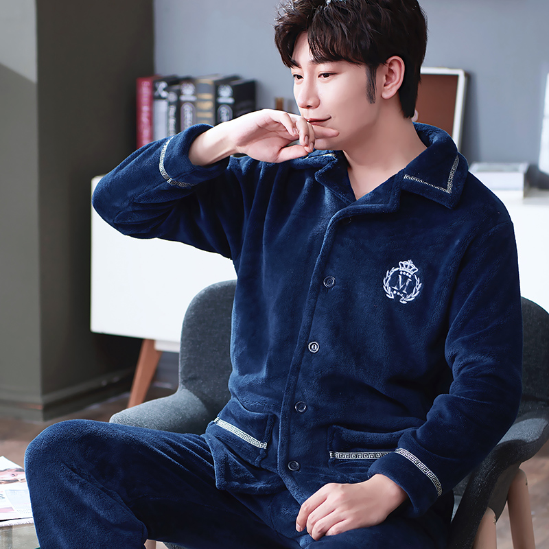 睡衣套装 法兰绒冬季 长袖 大码 青中年休闲珊瑚绒家居服 开衫 秋冬男士