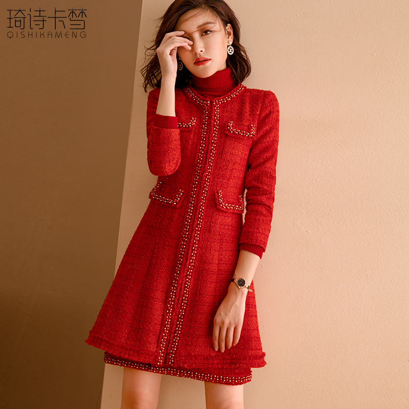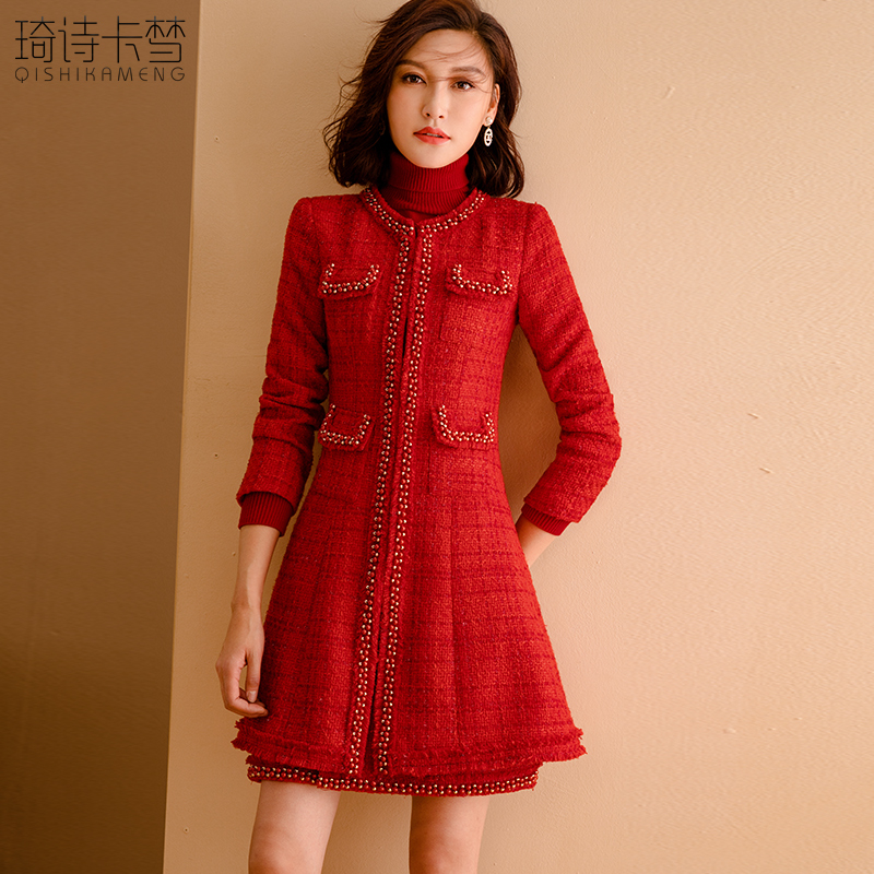 预售COCOBELLA小香风毛呢外套女新款 醋酸大衣WL3226 粗花呢中长款