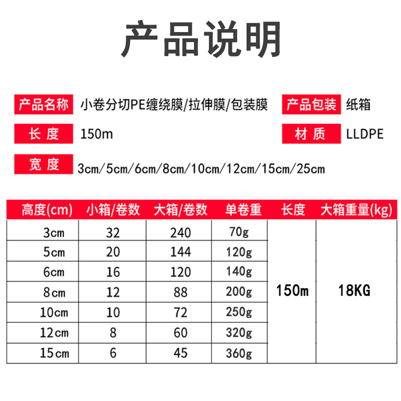 PE大小卷缠绕膜宽5cm6cm10cm外卖打包装 拉伸膜工业保护保鲜嫁接膜
