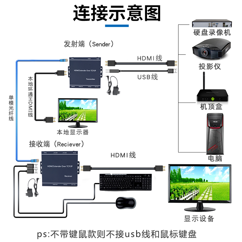 HDMI光端机音视频4K高清光纤收发器带鼠标键盘转光纤延长器转换器20公里监控电脑主机分屏器分配放大器传输器