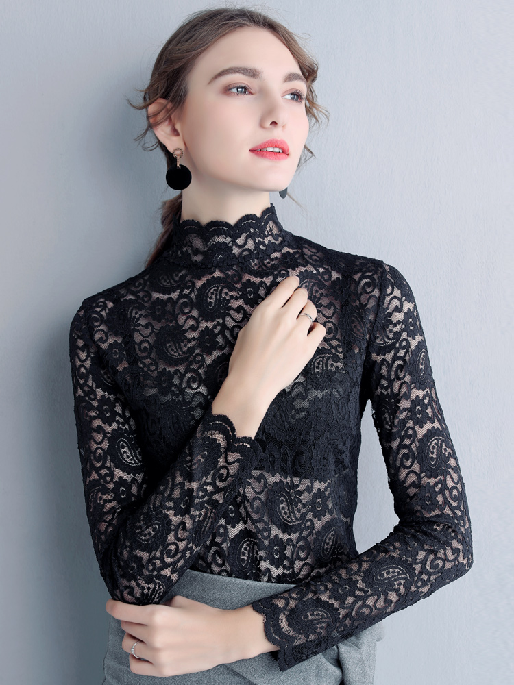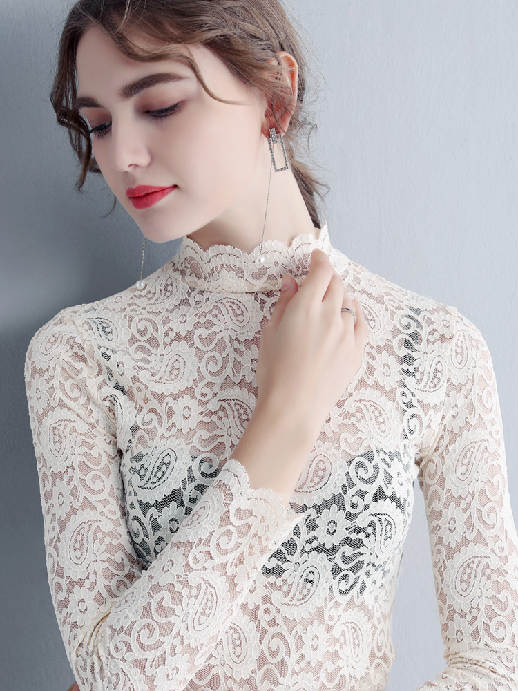 秋冬毛衣内搭纱衣洋气紧身网纱上衣 女长袖 白色高领薄款 蕾丝打底衫