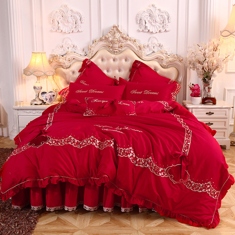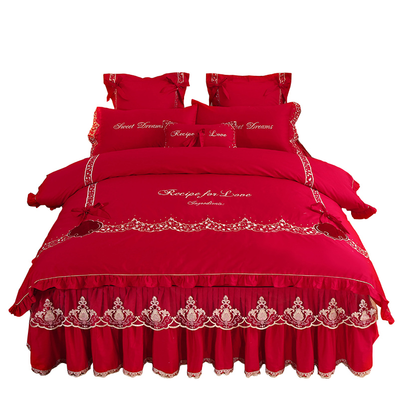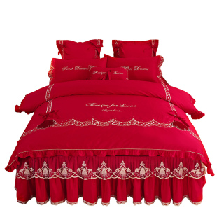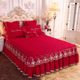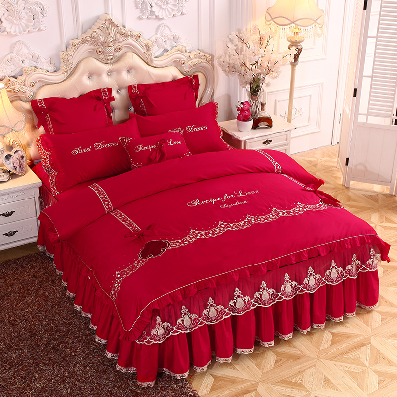 欧式 婚庆大红色夹棉夏天蕾丝花边公主风1.8m床上套件 四件套床裙款