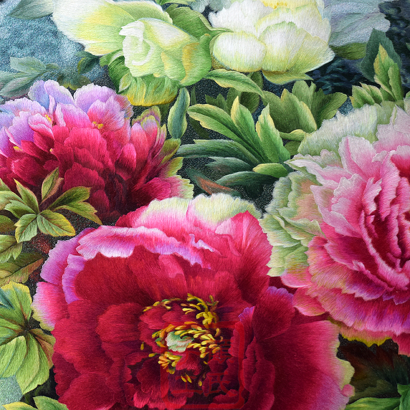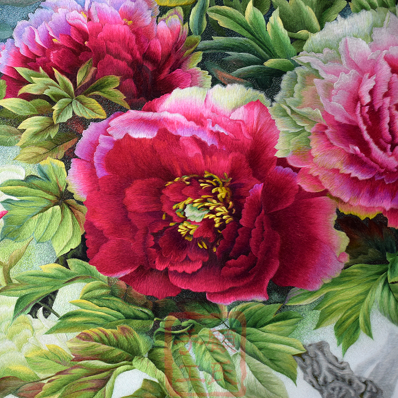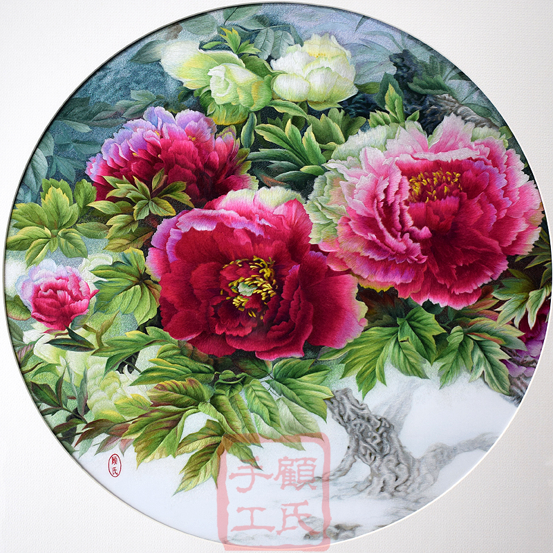 4丝刺绣国色天香沙发玄关别墅墙壁画 95顾氏手工苏绣牡丹争艳1