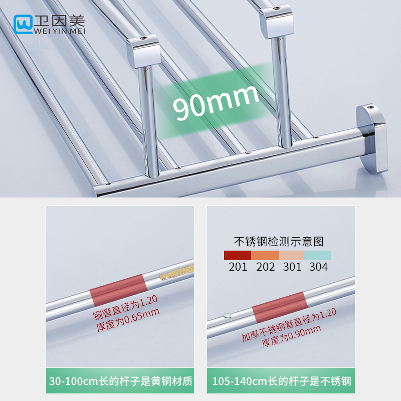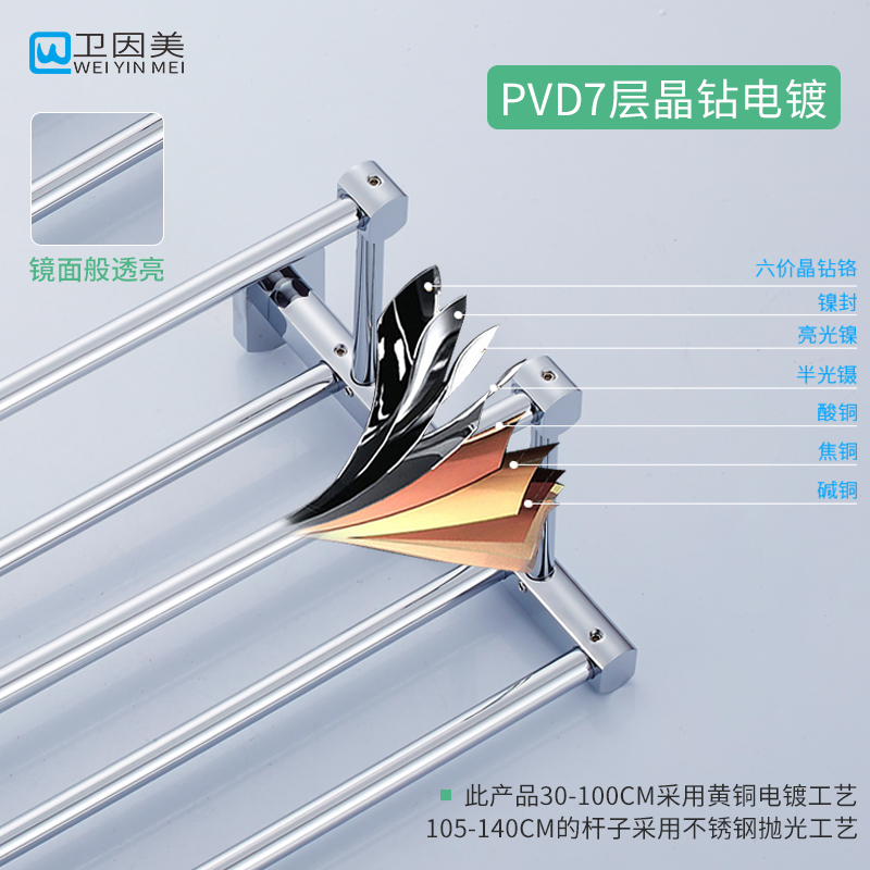 65cm免打孔 全铜浴巾毛巾架双层加长1.2米卫生间浴室70