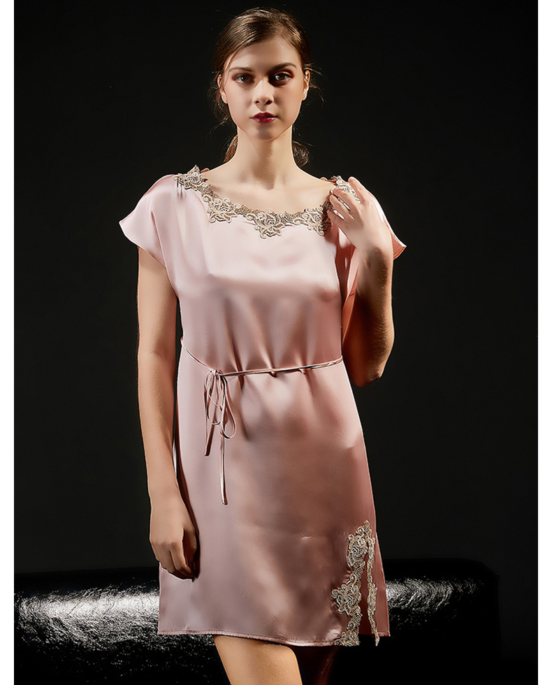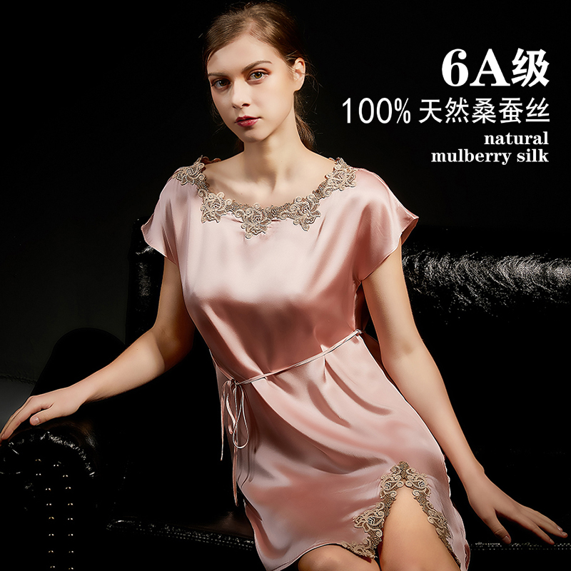 100%桑蚕丝正品 凉爽真丝睡衣腰带宽松加大家居服 睡裙蕾丝花边短袖